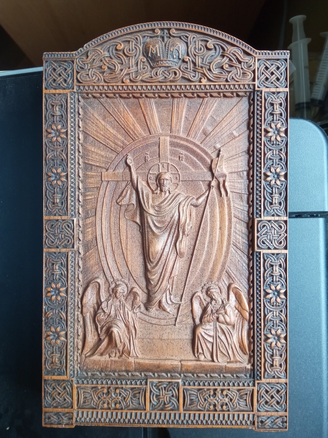Итог: При движении по X произошел сбой не знаю чего. Можете наблюдать в правом нижнем углу иконы. От этого схватил много геморроя, т.к. уже была черновая обработка с припуском 1мм. Все равно пришлось подрабатывать наждачной бумагой в районе рук и головы образа.