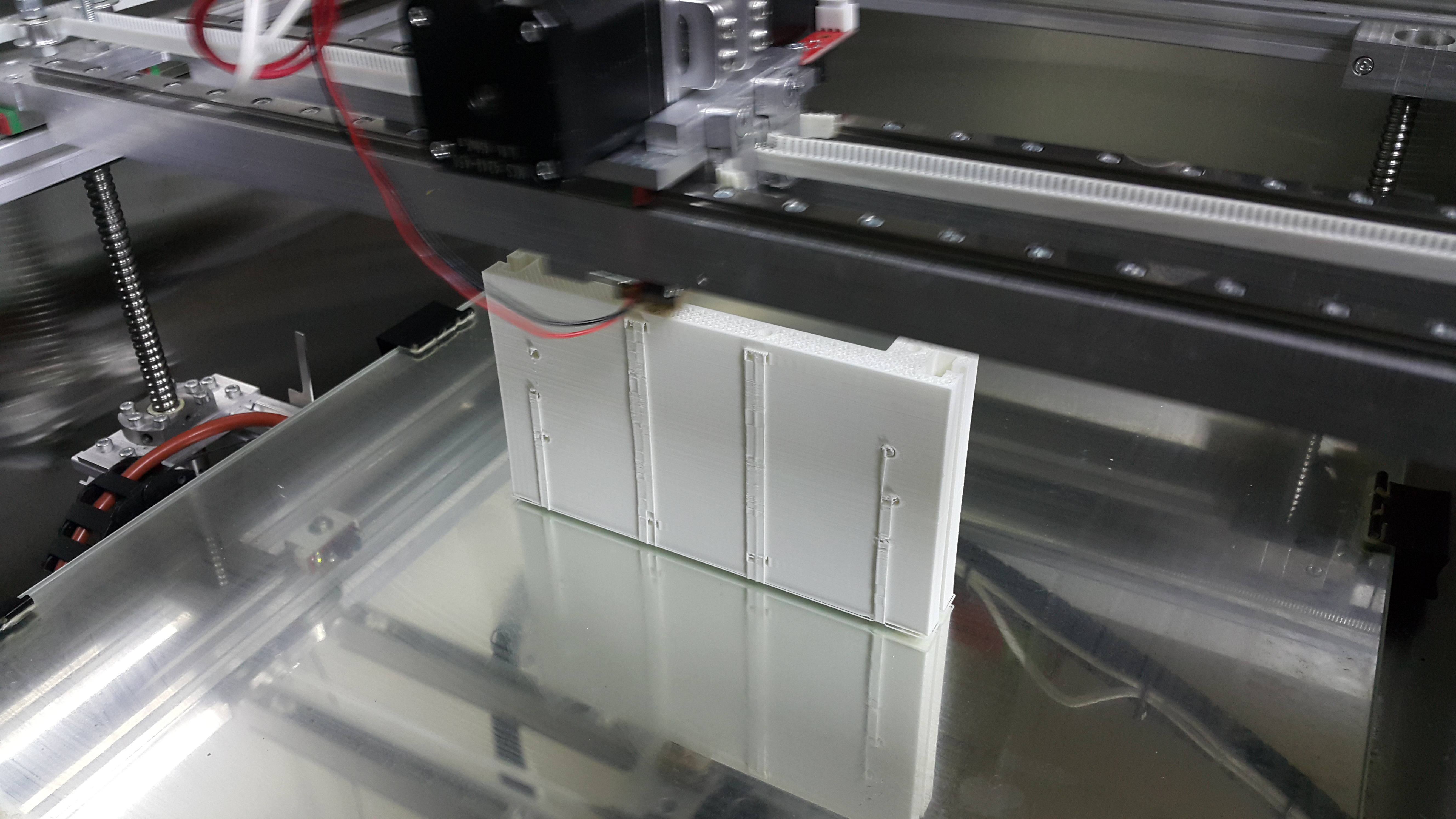 Общее время печати около 4 часов, сопло 0.4мм, толщина слоя 0,2-0,3мм, заполнение на 25%, стенки по 0,8мм. Скорость печати: первый слой - 30мм/сек, последующие - 100мм/сек. ABS пластик дешевый, фирмы FDPlast. Сопло на 250°С, стол на 110°С