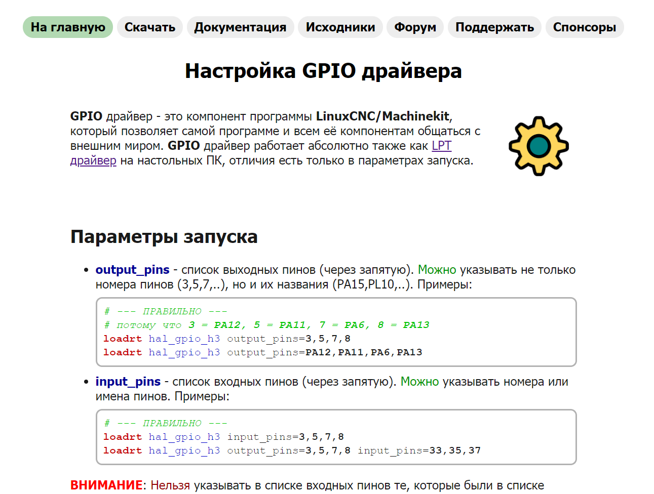 Раздел "Настройка GPIO драйвера". Довольно странно отображает - делит экран пополам (на 2 колонки), слева описание что такое GPIO драйвер (но оно почему-то снизу), справа примеры. "Можно указывать не только номера пинов (3,5,7,..), но и их названия (PA15,PL10,..). Примеры:" Думаю что номера пинов избыточны и не стоит новым пользователям привыкать к ним. Лучше оставить только по названиям портов - будет меньше путаницы. А вдруг пользователь захочет сделать адский микс и потом разбирайся в такой конфигурации (типа как в примере "пины"). Как бонус отпадет необходимость в предупреждении - по именам не промахнутся с подсчетом.