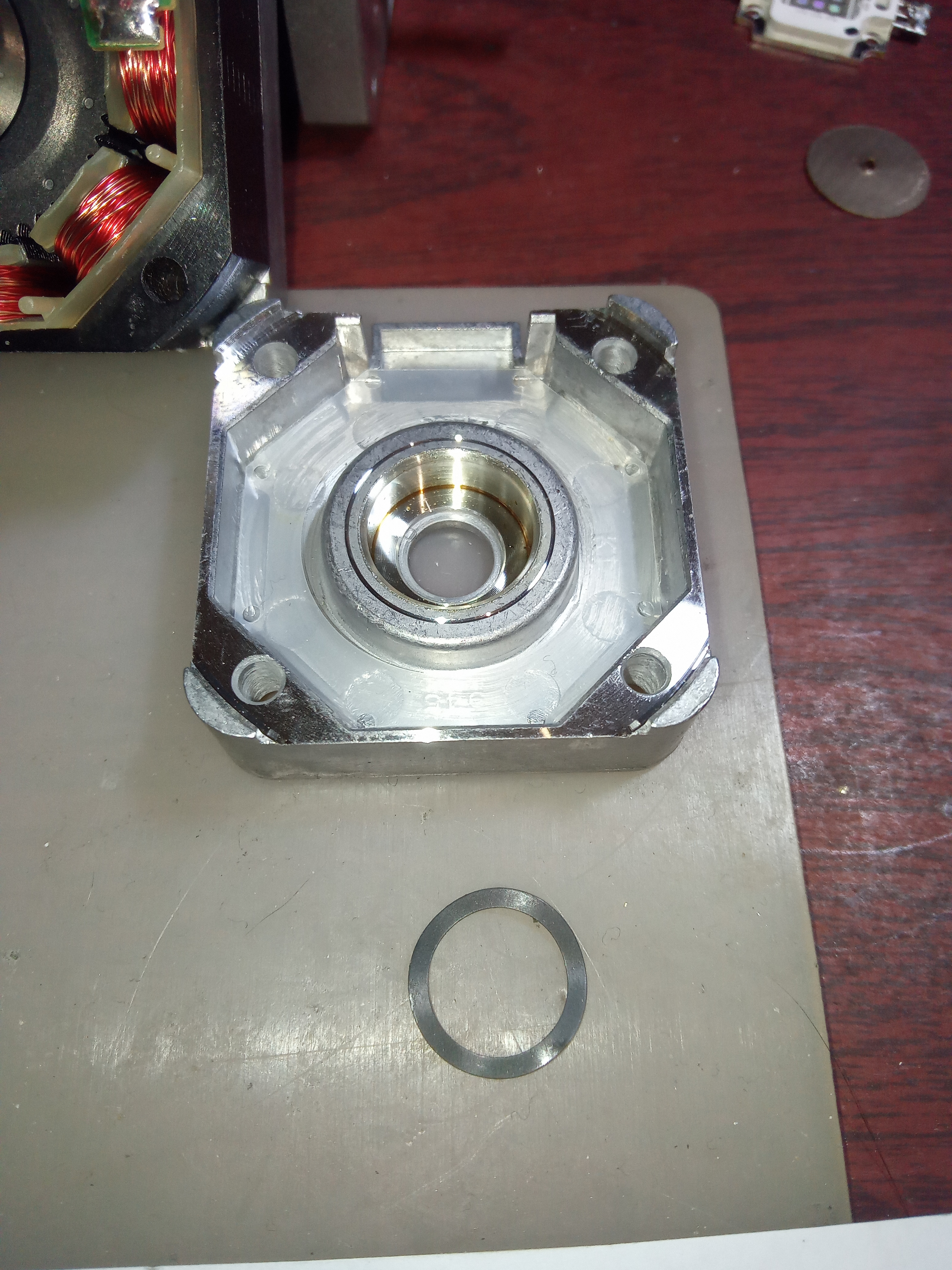 Продольный люфт должен быть - внутри стоят обычные радиальные шариковые подшипники. Да, они могут нести некоторую осевую нагрузку. Но зажав их шайбами (сильно сомневаюсь что хотя бы шлифованными) вы загнали их в нережимную работу. Дело конечно ваше, но не удивляйтесь если ШД начнут вдруг клинить и гореть (правда сколько они до этого момента проходят неизвестно). Лучше добавьте пружинку - другую пожертвовав старым ШД.Alltyp писал(а):Выборку люфта сделаю шайбами.