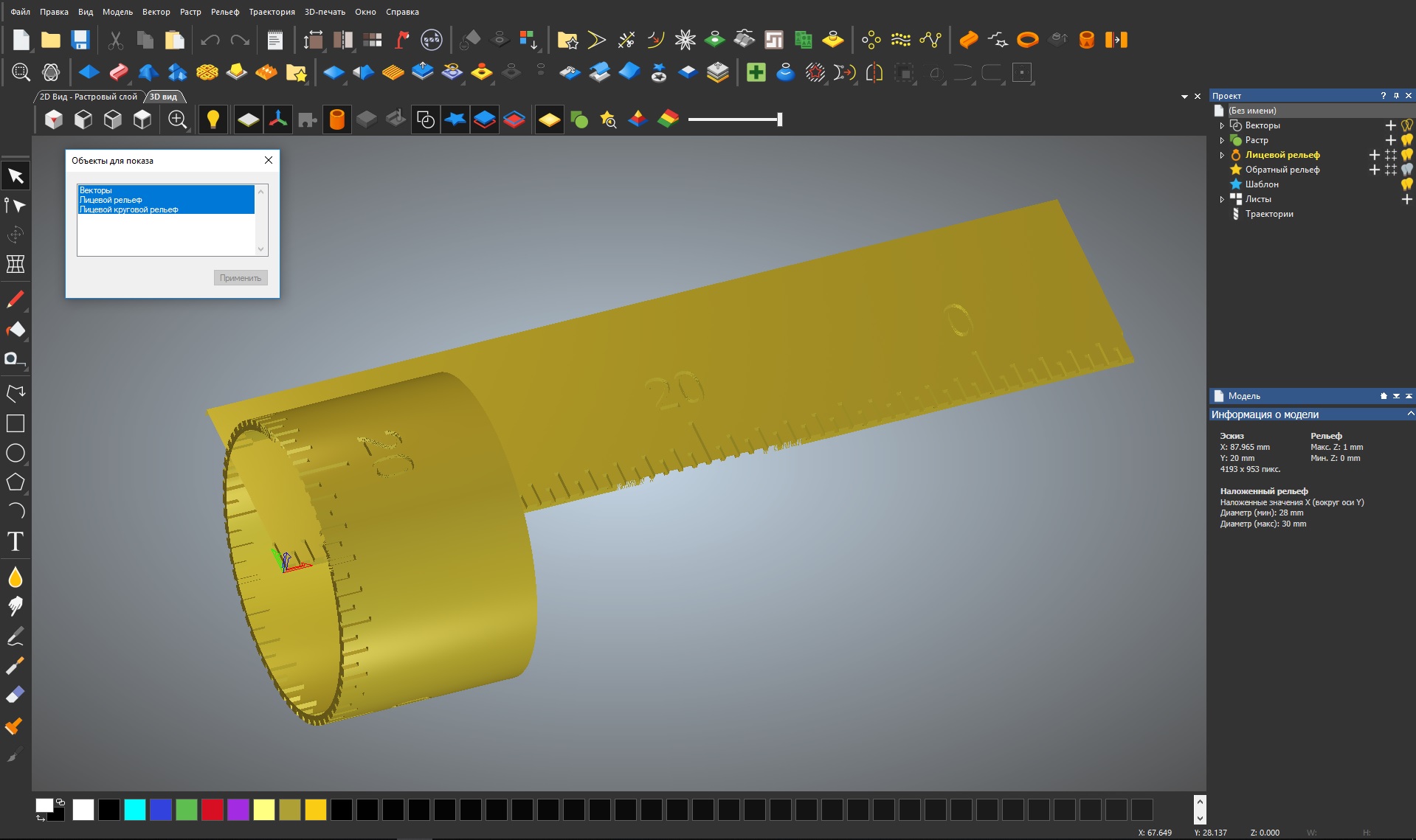 Разместил, как в большинстве рекомендуют Расположение вставленной замкнутой развертки совсем не такое, как на видео (должно быть, как подтвердил вставку - см. 1 фото), но сама развертка в доль оси Х, что мне и нужно. И для гравировки хочу использовать по центральной линии, гравером 90 градусов, но как с рельефа получить вектор?