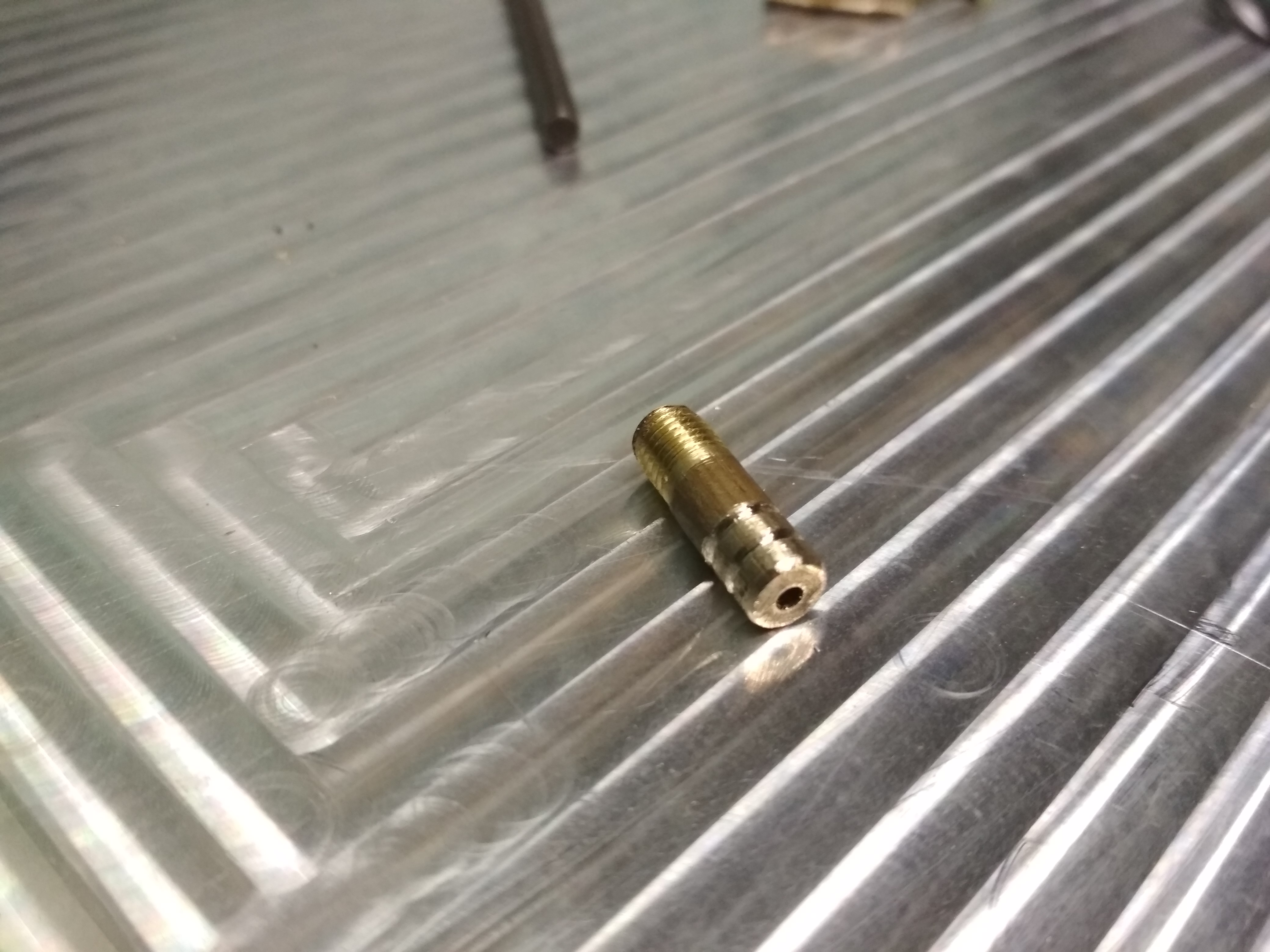 Масленок я так и не нашел больше и решил раз уж не найти сделаю сам, нашел где то в недрах бардака кусок латунной присадки 6 мм и нарезал из нее масленок на коленке, хватило как раз впритык.