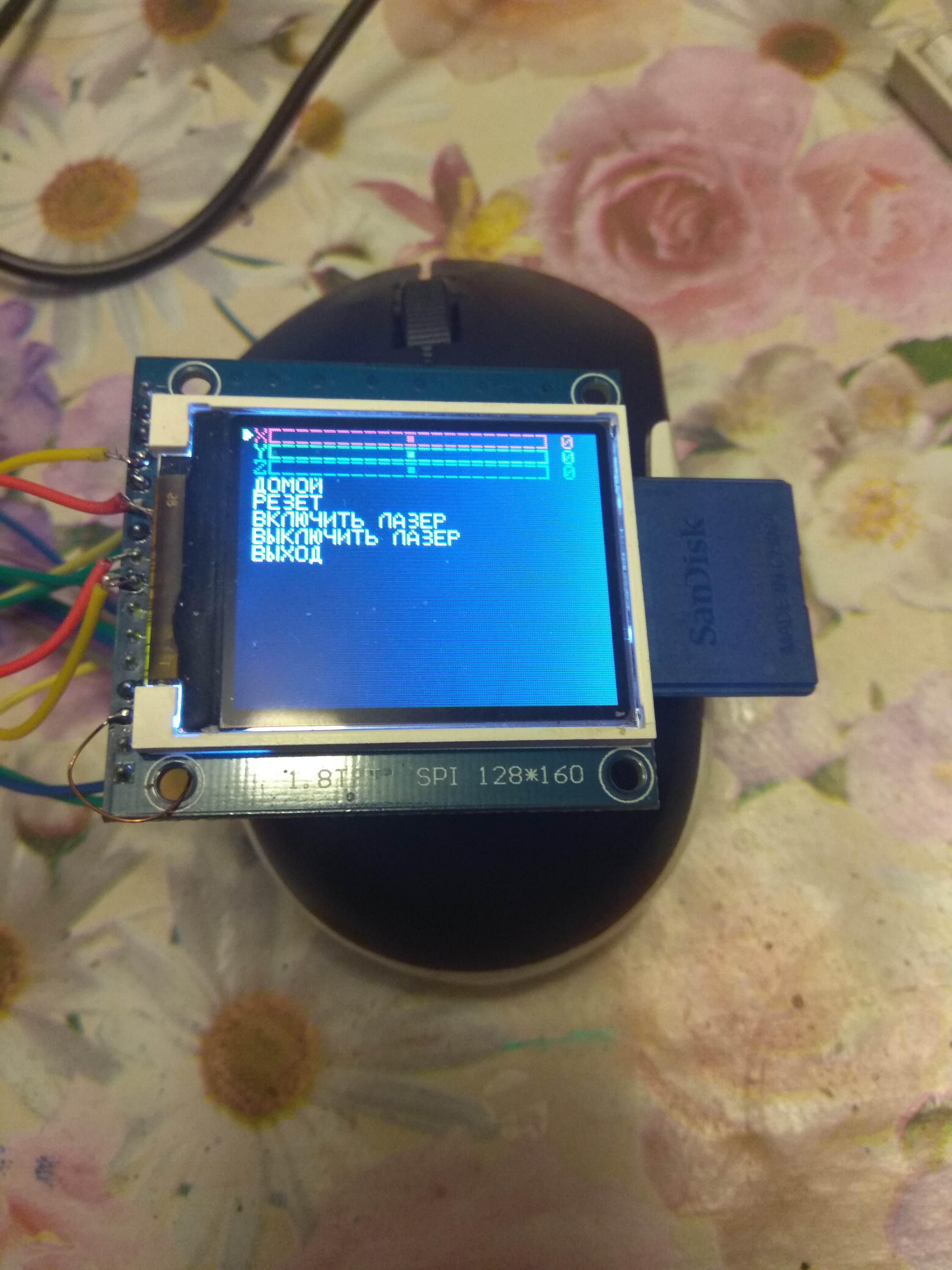 Здравствуйте , мне пришло сообщение но я пока не могу писать личные сообщения по правилам форума, отвечу здесь вопрос был по экрану и подключению у меня тоже не такой как у автора темы но если он на 7735 то ножки должны быть такие-же названия могут отличаться, sck это ножка тактирования подключается к 13 пину ардуины sda ножка данных 11 пин ардуины эти-же пины для карты используются а резет, чип селект(cs) и линия выбора данные или команды (A0) есть в скетче у автора. Если подсветка от питания дисплея то ножка LED не нужна. По поводу прошивки пока нет времени ей заниматься много работы основной и что за контроллер такой 103? А больше не только из за русского я добавил ещё просчет количества строк в файле и вывод остатка на экран и включение лазера для фокусировки переделал немножко инициализацию карты чтоб не надо было перезагружать контроллер. Так понемножку и накопилось.