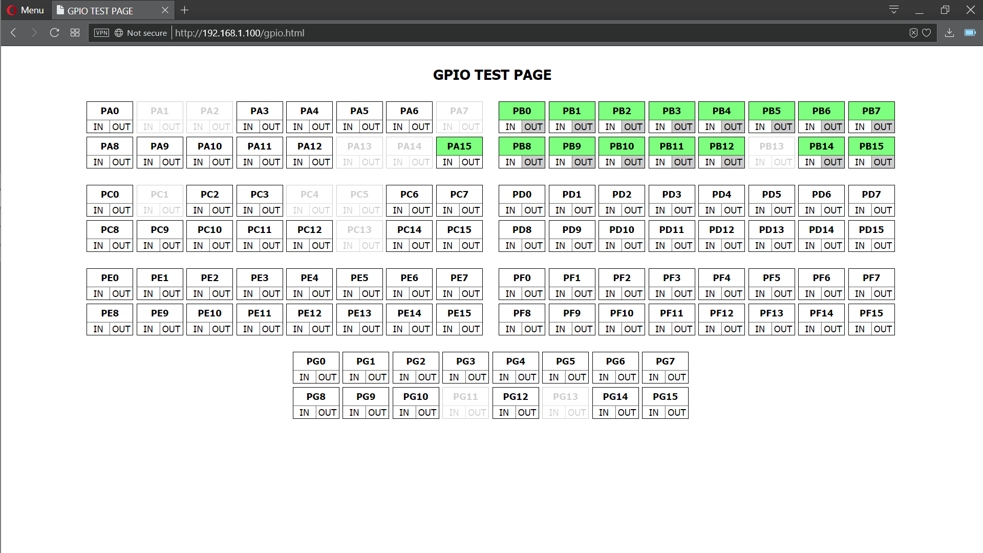 Добавил простой модуль управления GPIO. Для быстрой проверки пинов запилил веб страницу, где показано состояние и тип всех пинов в реальном времени. Стессна, насколько это возможно в границах веб технологий. Менять тип и состояние пинов можно прям на этой же странице. Проверять датчики, кнопки и модули реле - самое оно. Если на странице видите какие-то косяки или что-то непонятно, пишите. Функционал модуля GPIO буду расширять, чтобы дополнительно можно было менять тип выхода (push-pull, open-drain), скорость (4 типа) и подтяжку (к питанию или земле). Соответственно, веб страница тоже будет доработана.