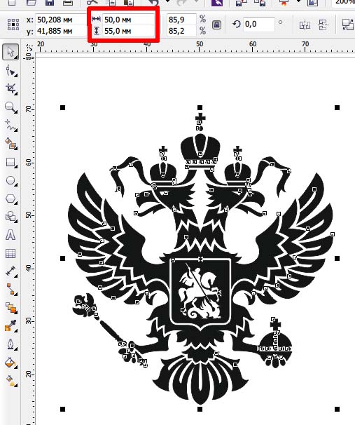 Вот берем Корел, делаем птичку 50х55мм Экспортируем в растр (bmp) с разрешением 127 точек/дюйм (5 точек/мм!!) Тут один пиксель добавился (особенности конвертации). Не думаю, что это помешает "спасти отца русской демократии". ))