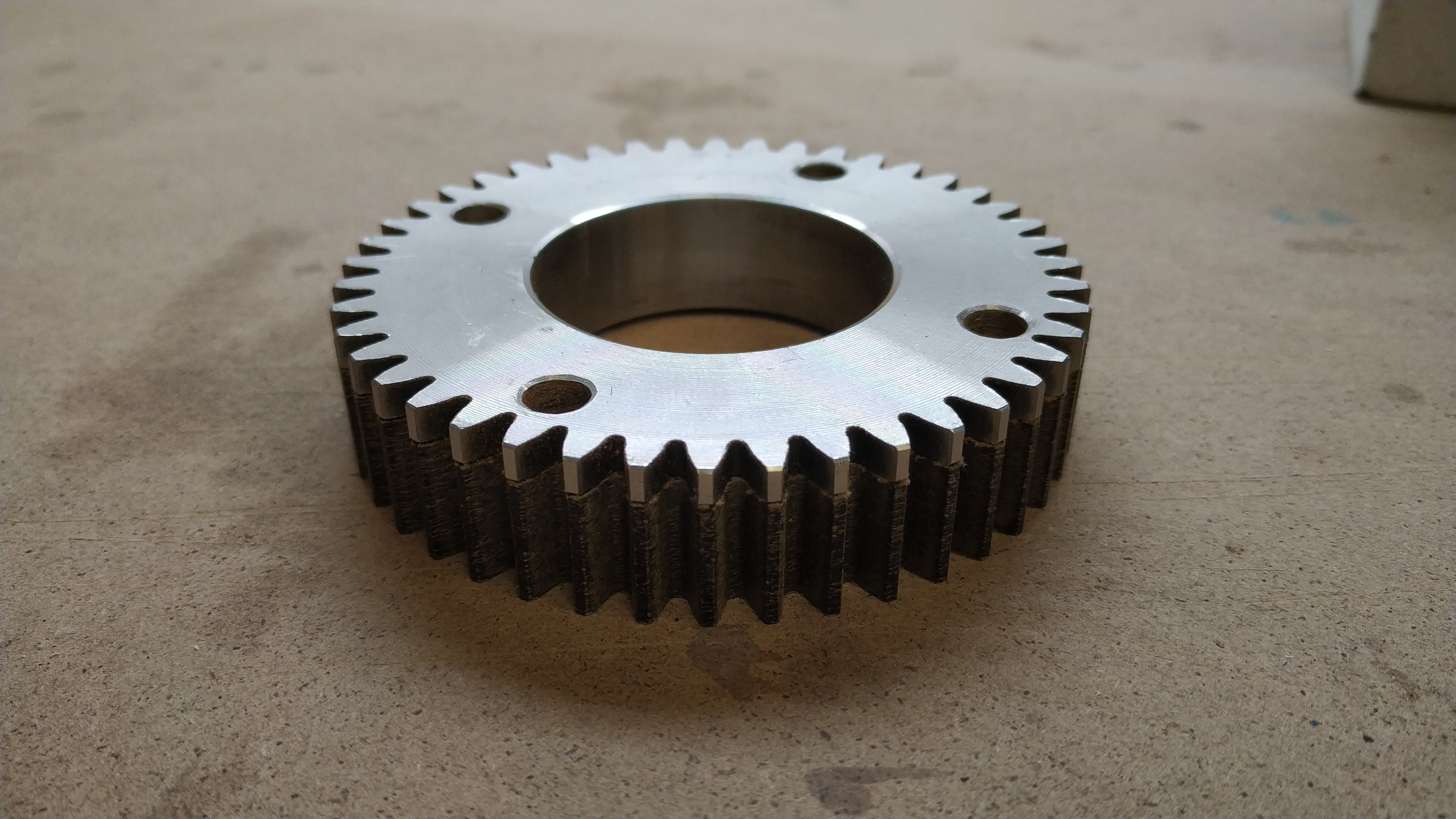 Пока начертил стандартную шестерню, получилось 44 зуба, модуль 2. Пильнул из фанерки, зубья вроде совпадают. Попутно изготовил стакан под подшипник на выходной вал.