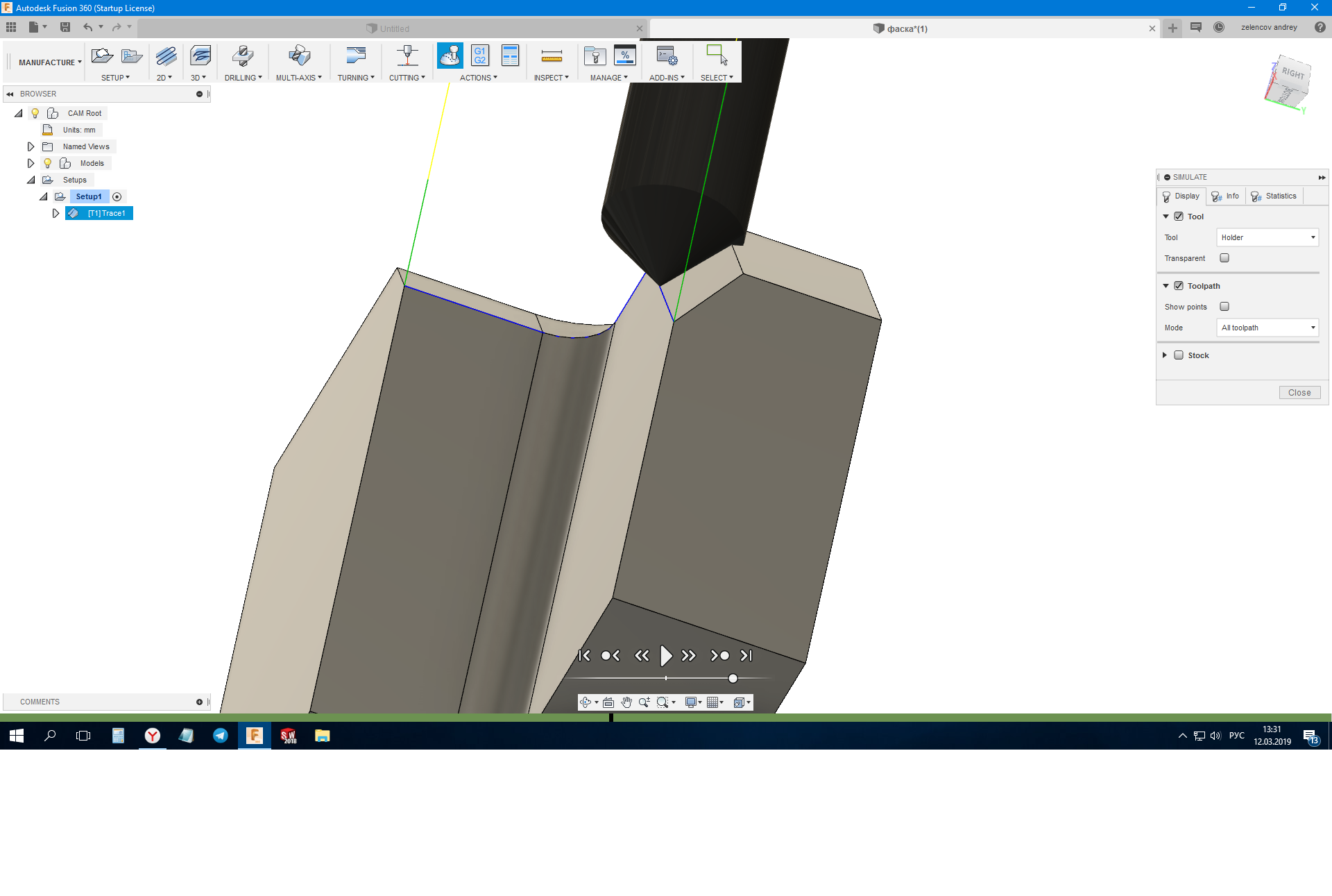 А зарезы какого плана? просто там где вниз опускается, если фаска под 45 к наклонной поверхности, то относительно оси фрезы - это уже не 45гр будет, а более острый угол. Может эти зарезы и имеете ввиду? А так фаски на кривых и наклонных обычно делаю операцией - trace, далее там есть настройка chamfer. но по модели без самой фаски. нижняя кромка будет ровная, а верхняя уже переменной ширины соответсвенно, тк ось шпинделя надо поворачивать, чтобы она была одной ширины. на 3х осях за проход это не возможно.dc90 писал(а):добрый вечер. не знаю был тут такой вопрос или нет. не могу подобрать стратегию фаску по контуру с опусканием по Z. показано стрелками. зенковка или фреза фасочная диаметром 10 угол 45. что бы не пробовал - зарезы идут где по Z опускается. одним треком надо. делаю руками этот проход - вычисляю геометрию и прописываю кадр еще один после контурного прохода вниз по Z. но хочу программно во Fusion 360