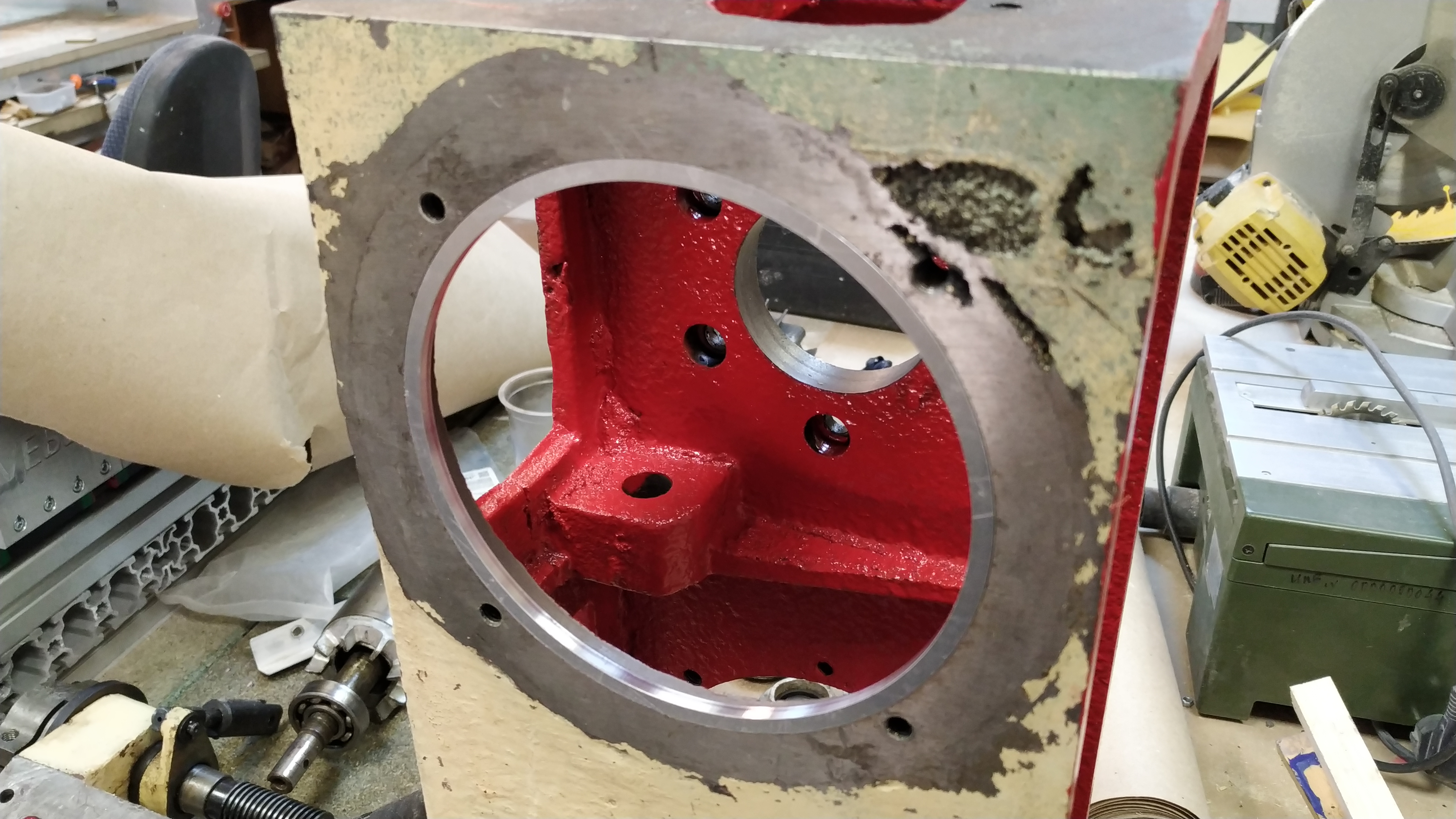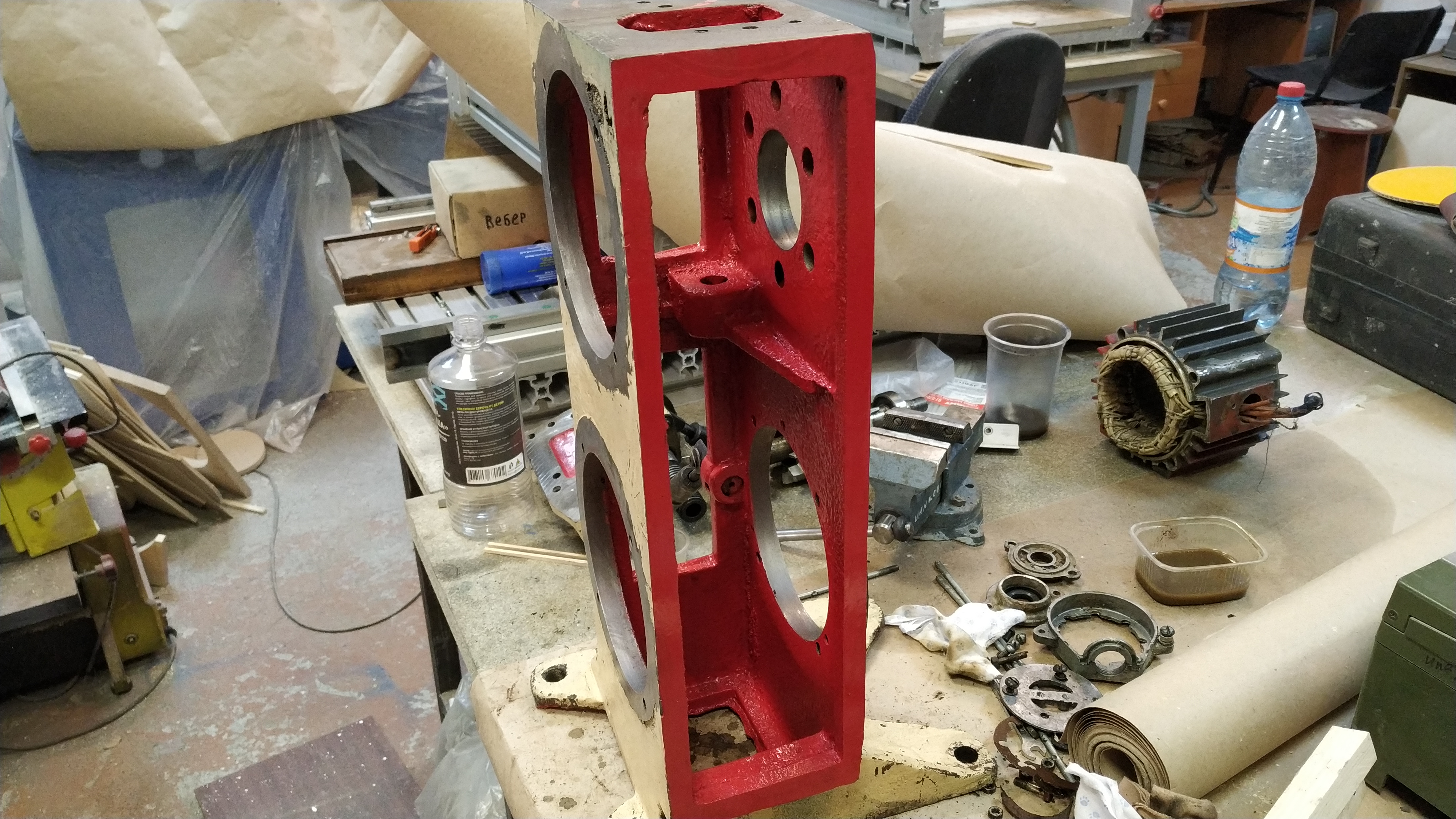 "разбил" крепежные отверстия во фланце двигателя на фрезере. Корпус вариатора покрасил пока внутри. Снаружи буду красить в сборе с коробкой и двигателем. Посадка с кольцом