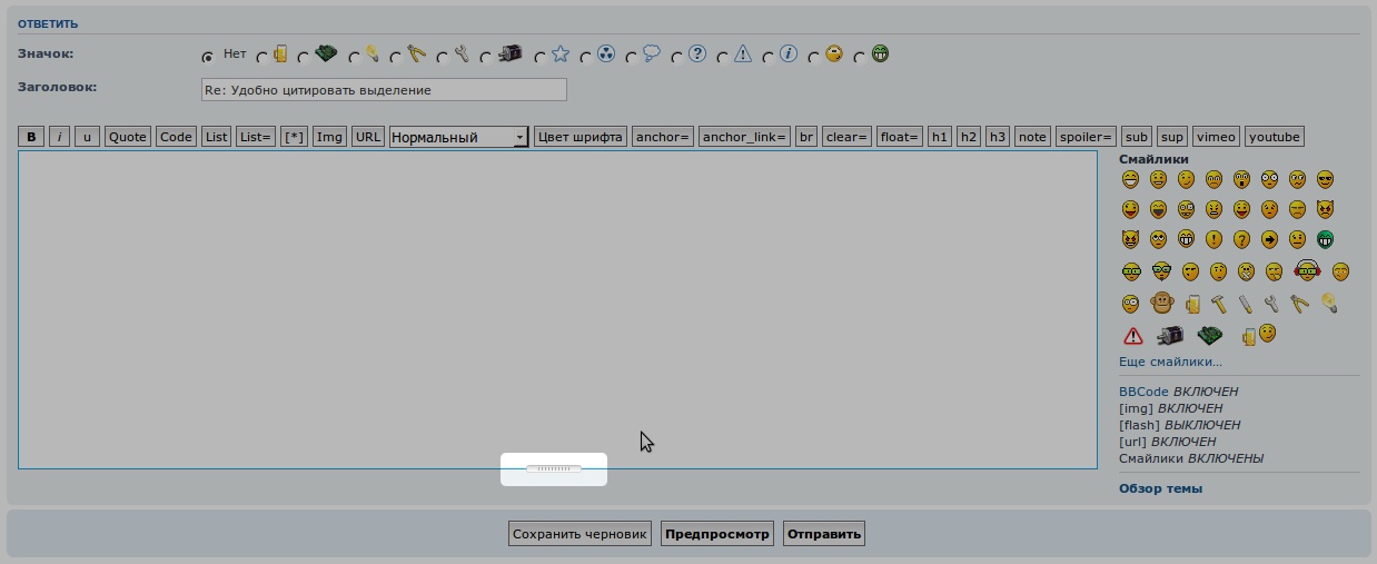 Когда на форуме появится нужная кнопка в нужном месте, цитировать выделение?