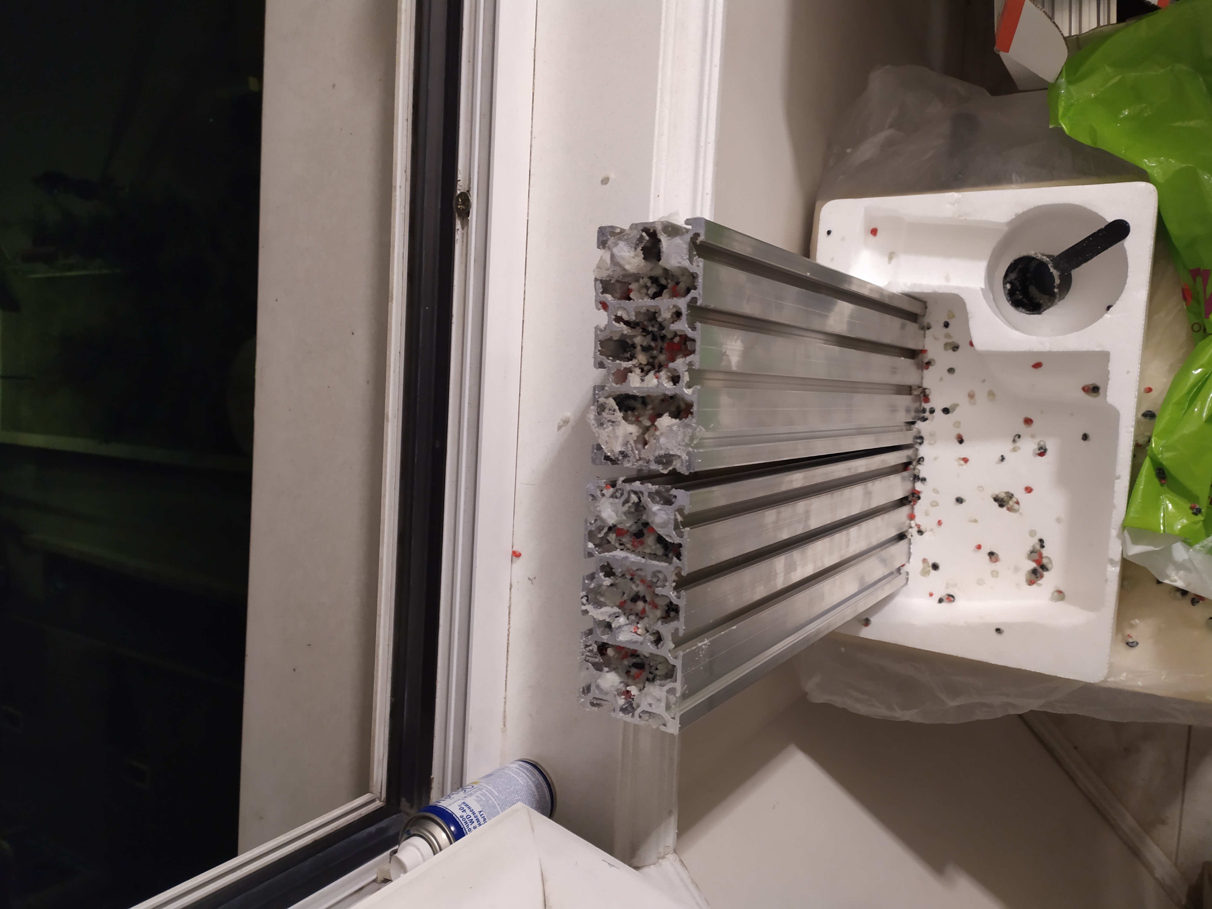 Ну а что, сделал толстый слой, немного сверху надавил торцом и и затем в морозильник. После морозильника, пластилин твердый будет, и можно спокойно засыпать смесь. А отверстия в профиле (видите на фото, вдоль отверстия идет разрез, в который смесь набьется) заклею сантиметров на пять вдоль профиля изнутри просто скотчем, вставив всю ту же пробку из пластилина где то на глубине 5 см. Когда буду нарезать резьбу, скточ не помешавет нарезке.