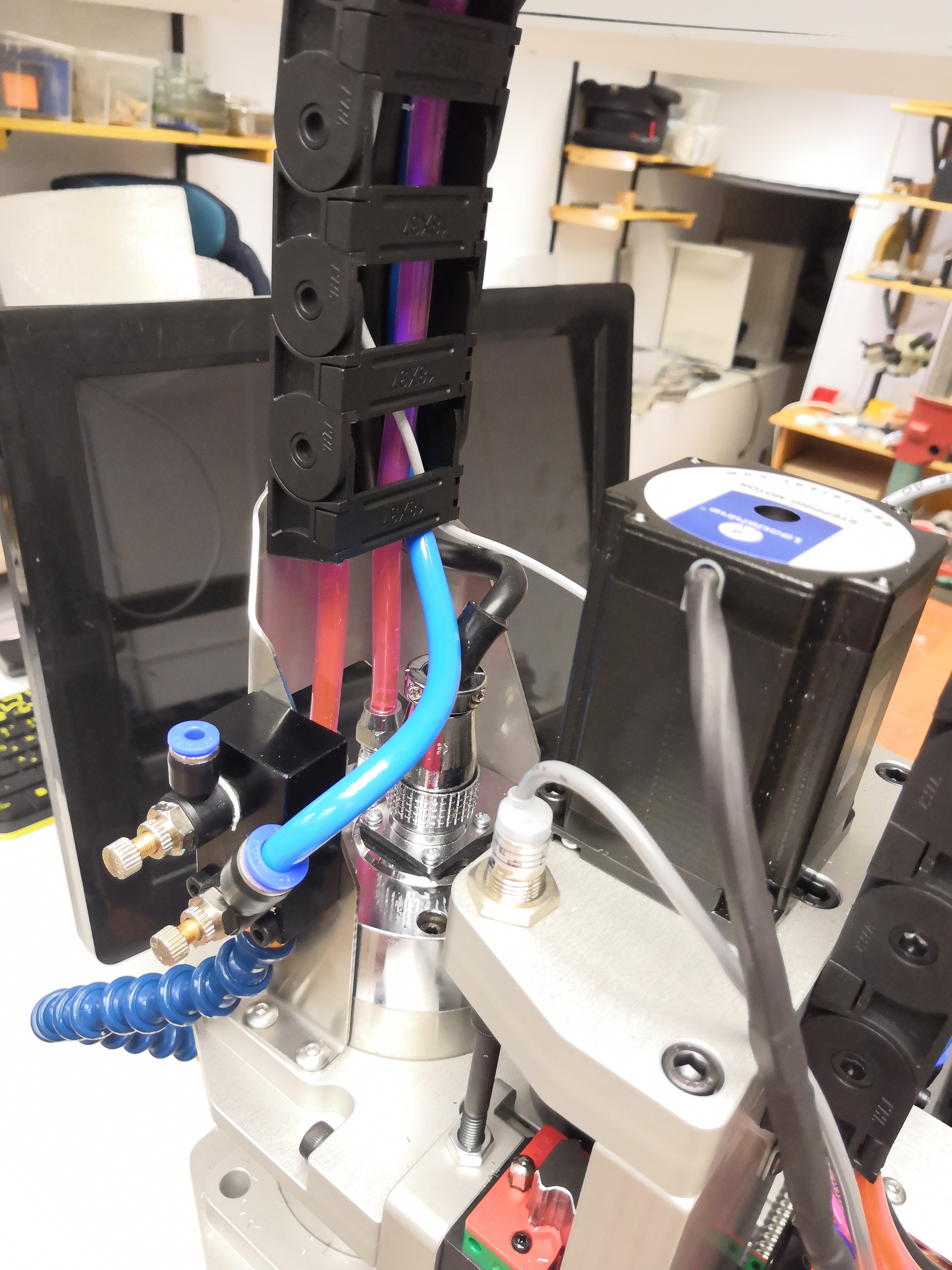 Какой-то головняк лишний. Вместо того, чтобы две трубки 8мм под стол завести, нужно эти два трубки завести на портал, туда же завести провода на насос и вентиляторы. Всё это будет болтаться при хороших ускорениях как х в рукомойнике :)
