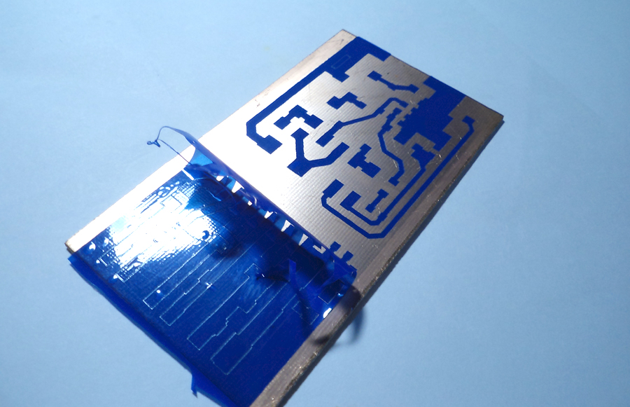 С той части, которая должна травиться в хлорном железе сдираем скотч как наклейку, поддевая пинцетом.
