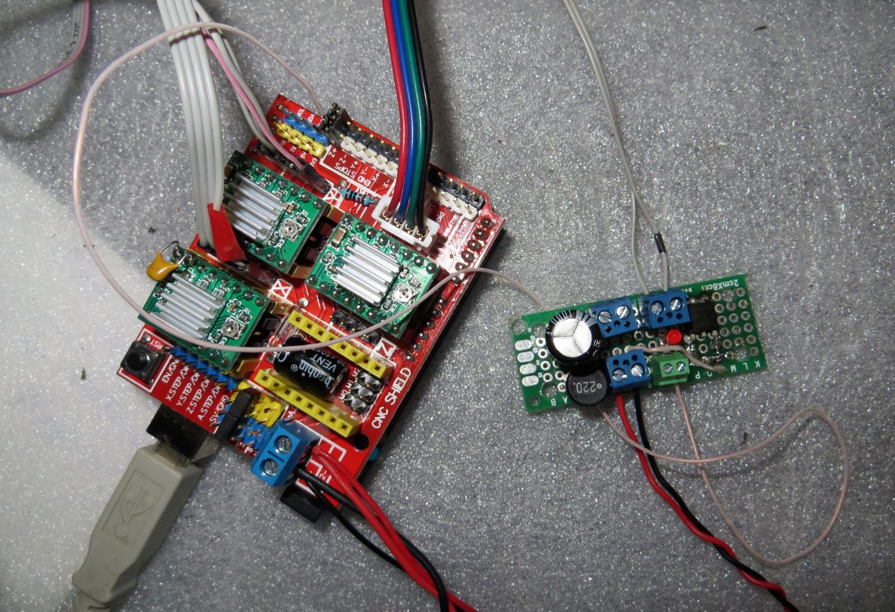 подключил проводами типа папа-папа и о чудо,все заработало...выставил 800 шагов шаговики запели,треск пропал,и стали проходить как положено 10мм из 10...вывод: Китайцы творят что хотят :) ...Осталось разобраться с лазером...брать сигнал от ноги А6 ардуинки,которая отвечает за сигнал Step на драйвере оси Z,не вариант...при уходе в нулевую точку на нем пропадает питание и лазер остается включеным,ну и нет точный прожиг,а на лимите Z все так же 0.7в :problem:
