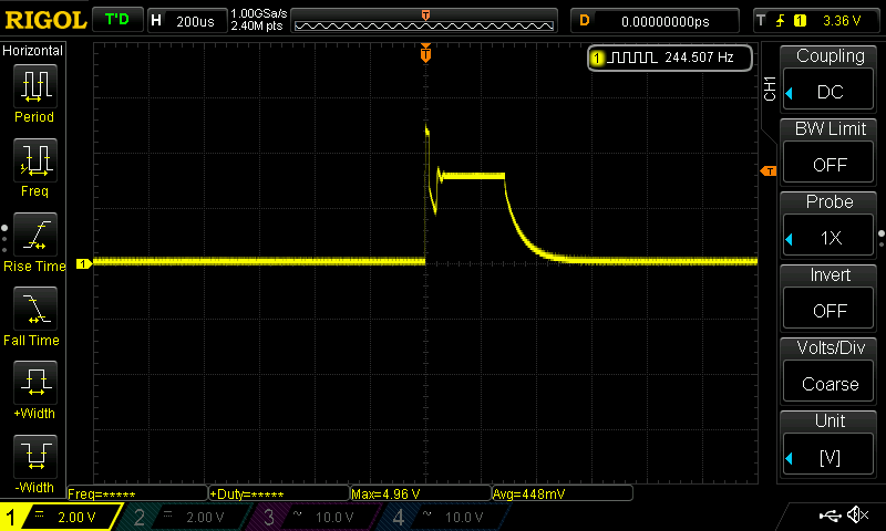 Подключил белый светодиод на 1Вт частота 4 Кгц ШИМ 50% сигнал на диоде не очень похож на ШИМ.