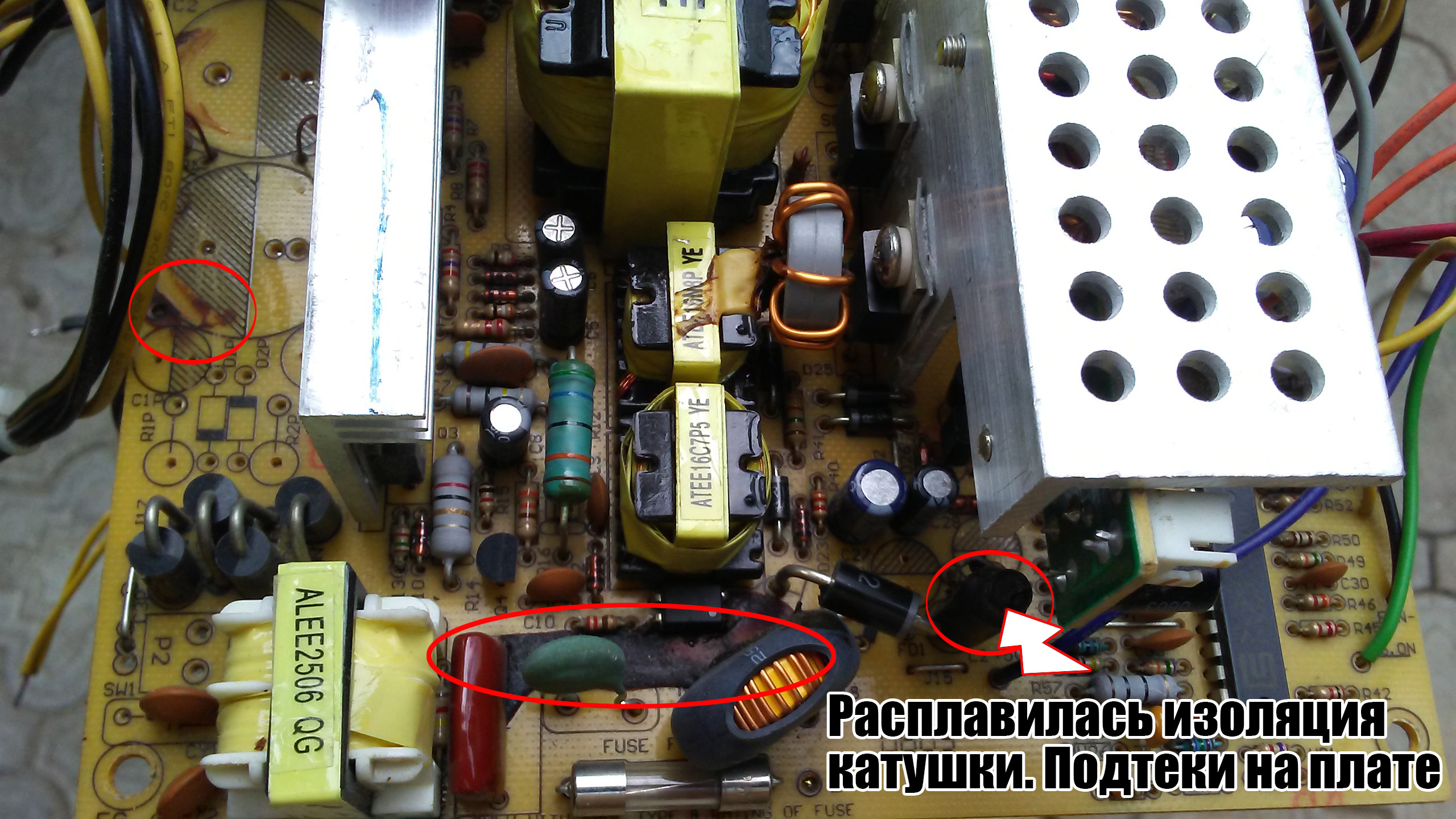 Константин61 писал(а):в блоке питания расплавилась изоляция катушки. подтеки на плате