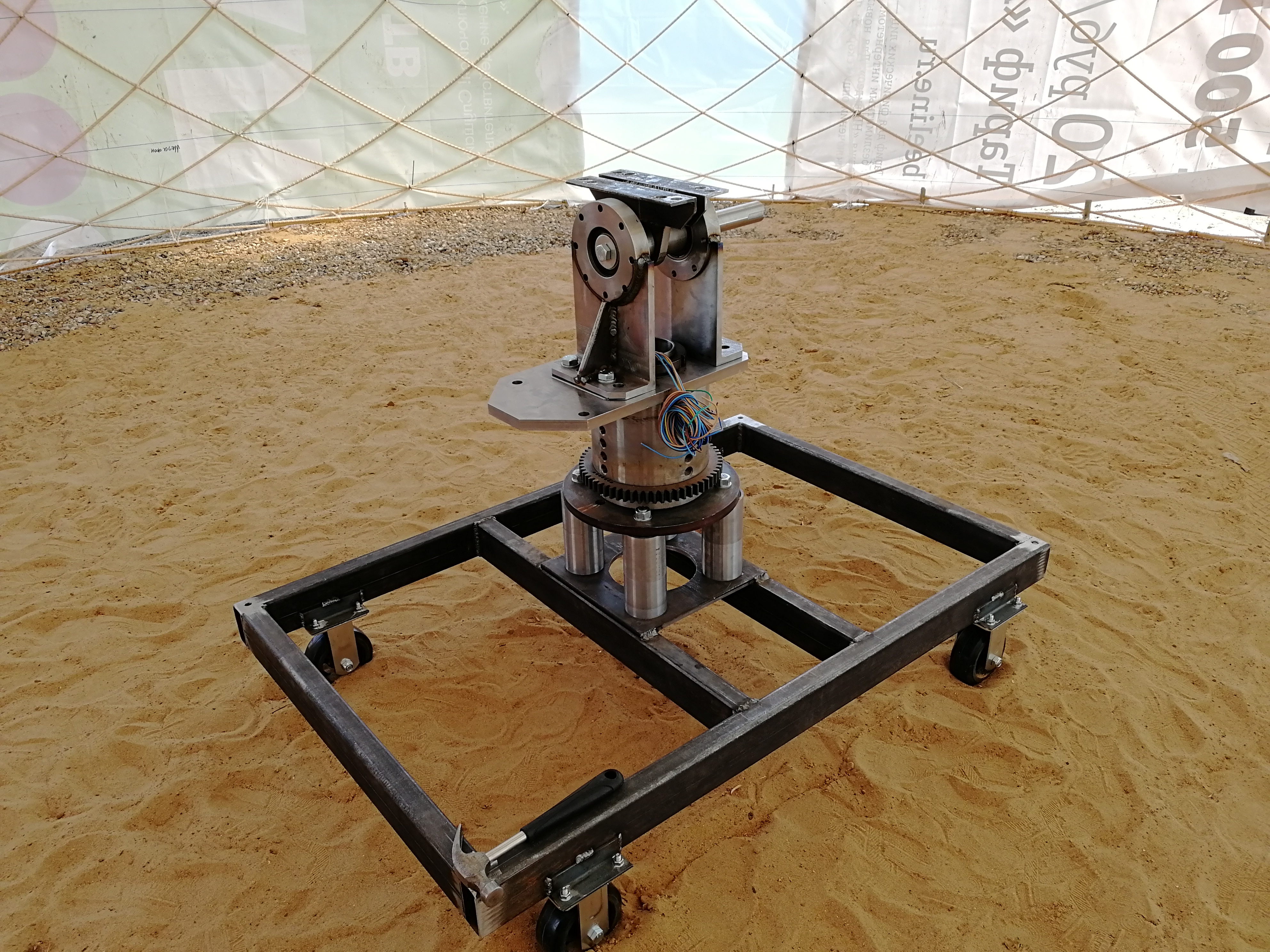 Надо бы площадку-плиту под тележку из твердого материала и тормоза на колеса. Иначе или на колесах не устоит - укатится или провалится в песок один угол и вся работа насмарку.