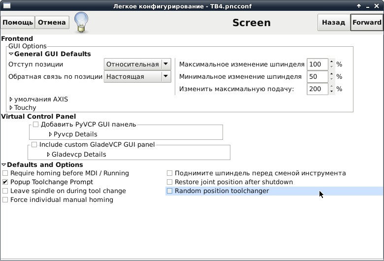 Скрины pncconf, где тут галочку поставить чтобы маховик заработал.