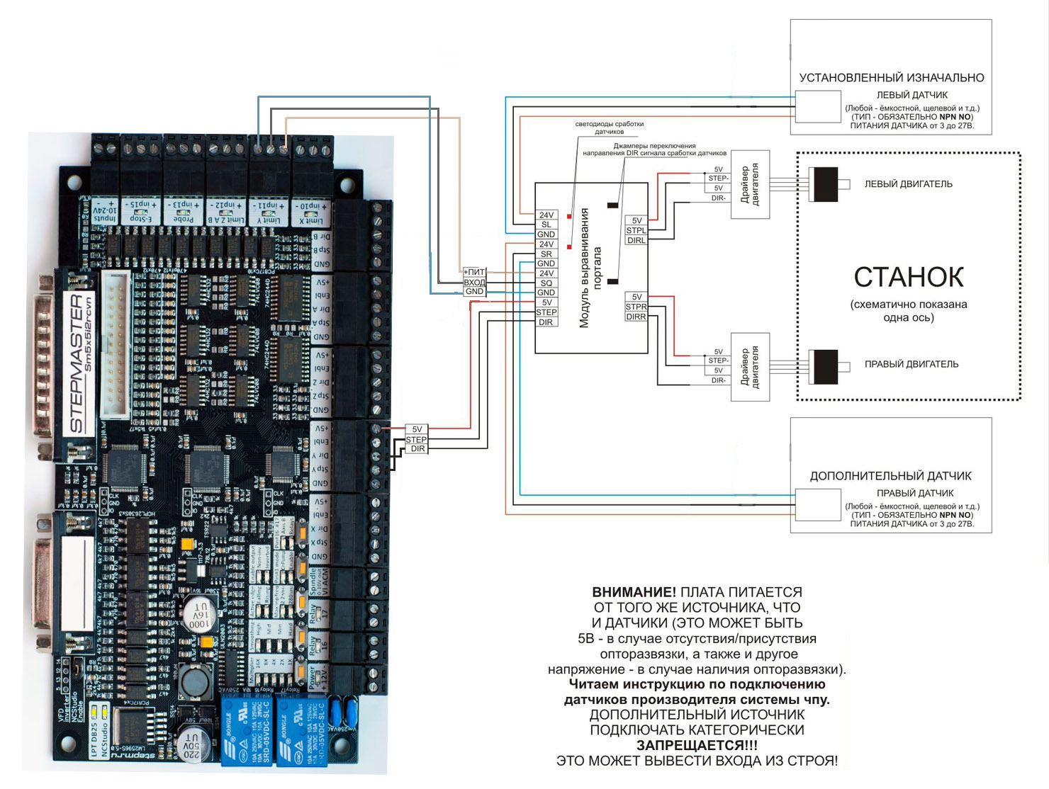 Ответ нашелся благодаря Shalek - вот схема подключения. Суть была в том, что указанное в описании Модуля "для питания 5в" не вполне верно - при 5В он будет только подавать признаки жизни, мигая диодами на срабатывании концевиков. Вот если подать +12В, будет работать. А применительно к данной серве еще особенность - дажмперы, переключающие направление вращения, сервой игнорируются (не спрашивайте), т.е. направление вращения мотора задается только на самом моторе.a321 писал(а):2. модуль выравнивания портала - как прознать, живой ли он? - подключенный мотор, пока один, не хочет двигаться. Измеряю напряжение между клеммами +5 и Stp & Dir - на степе есть жинь, на Дир не сказал бы (обычный вольтметр). Завести пытаюсь от СтепМастера.