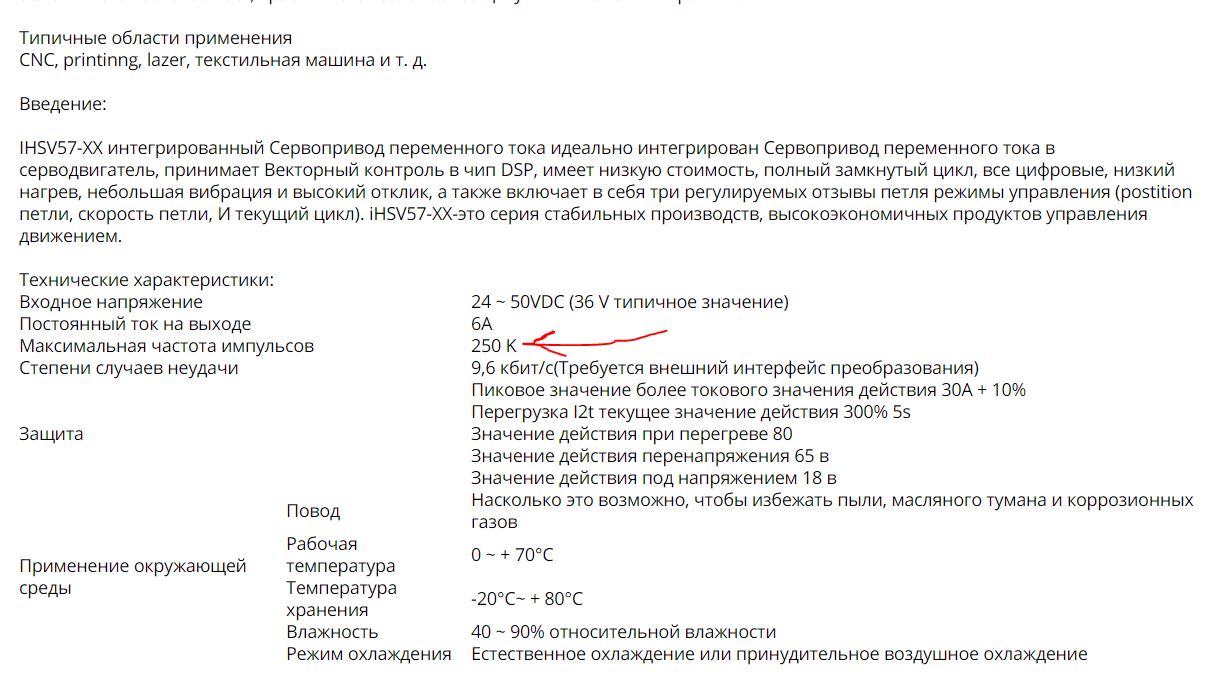 4. Микрошаг - не увлекайтесь, мозги у сервы слабенькие, если вдруг на максимальной или иной скорости, при ускорениях/торможениях управляющий сигнал превысит 250кгЦ = труба, серва молча, без выдачи ошибки, нажнет сопли жевать и ломать станок, подробнее Re: ihsv57 [РЕШЕНО] #18