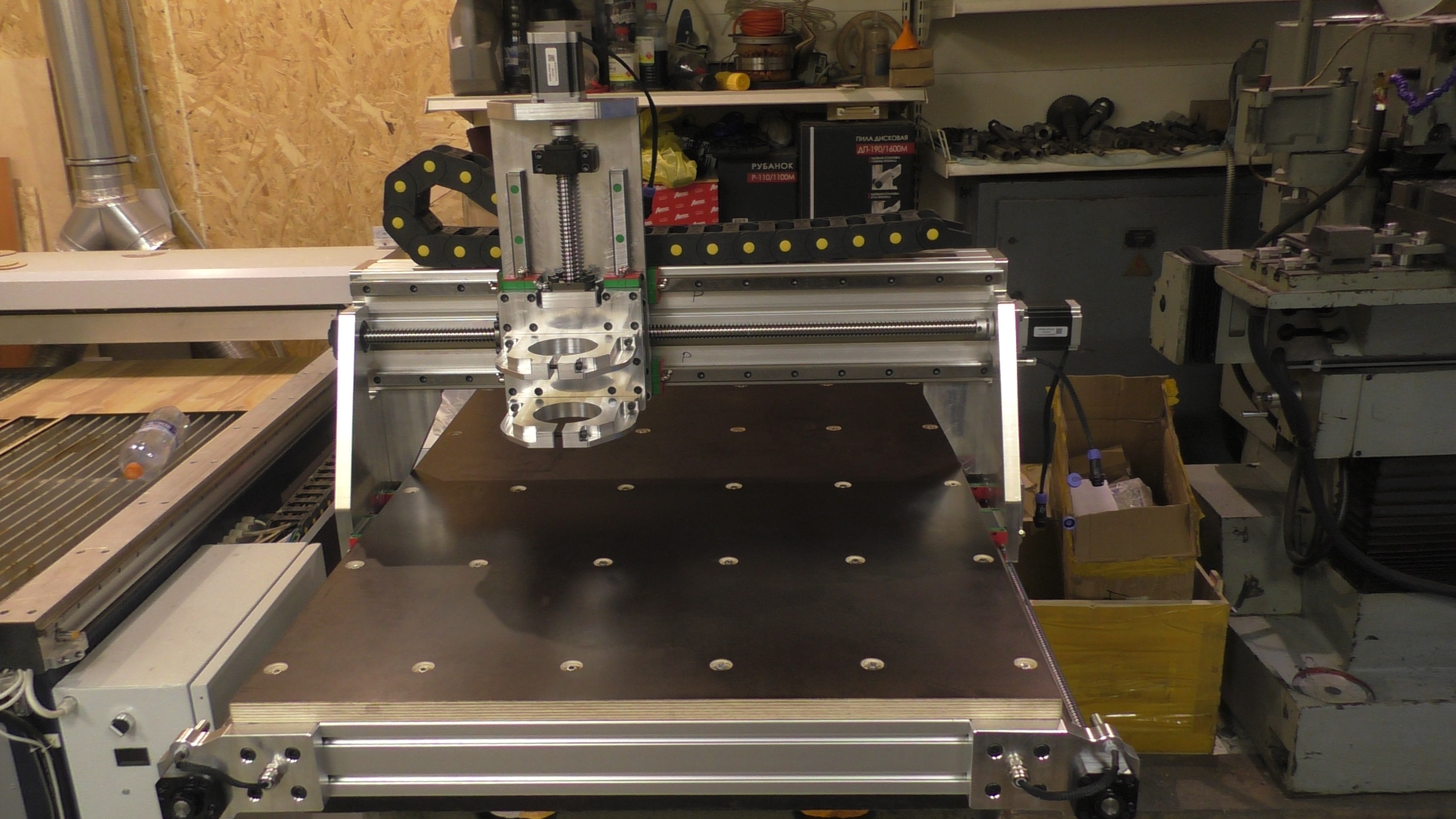 Но с некоторыми отличиями - поле чуть больше (600*900), винты по Х и У с шагом 10 мм, шаговики с драйверами попроще, шпиндель 2.2 кВт, раб. стол из ламинированной фанеры.