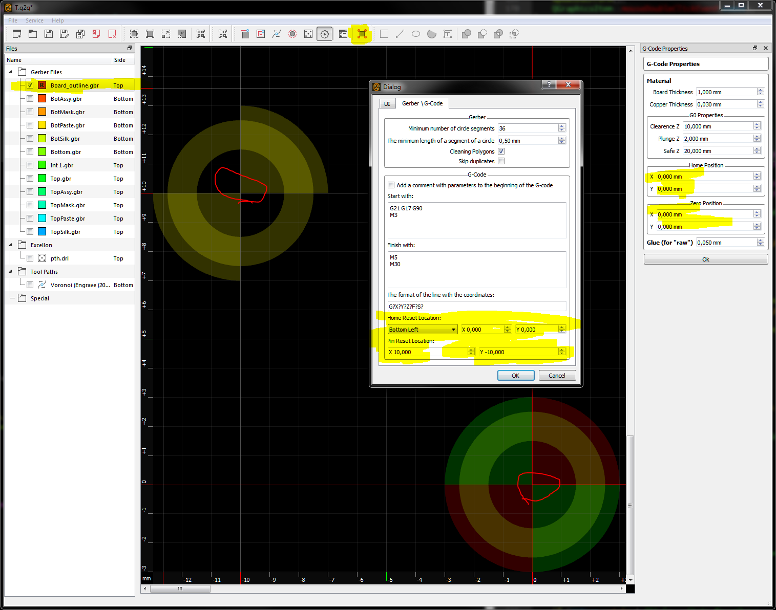 Но иногда фольга удаляется травлением (и многие радиолюбители тоже используют этот метод), ну а сверловка всё равно остается за CNC. И вот тогда используются дополнительные отверстия на плате (опять же назовем их служебными), чтобы как можно точнее позиционировать плату на станке, точно зная координаты отверстий. Ведь только от этого зависит в итоге точность попадания всех отверстий в нужные места почти готовой платы. В этом методе применяется и поворот осей координат и , наверное, ещё какие-то хитрости. Но всё будет исходить уже из координат этих служебных отверстий. Так почему бы реперные отверстия (их создание в G2G) не использовать для этого?