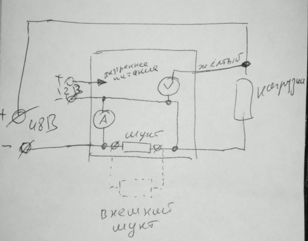 Мне кажется на схеме -12В должен быть соединен с -42В до амперметра, иначе потребуется отрицательное питание (дополнительный преобразователь, что усложняет схему) чтобы ток измерять.lkbyysq писал(а):Вот блок-схема прибора с подключением. Моделируйте теперь что куда подключали. Вольтметр - высокоомный прибор (через него не течет большой ток, он вряд ли сгорит). Амперметр - может быть низкоомный (значит через него может протечь большой ток и сжечь его).