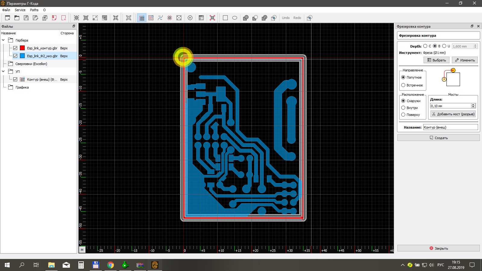 Я, кстати, пока выкрутился с кодом обработки своей платы - гравировку и обрезку сделал в этой программе - здесь реально очень удобно делать любой сложный контур обрезки, как в моем случае, а сверловку этой платы я сделал через FlatCAM