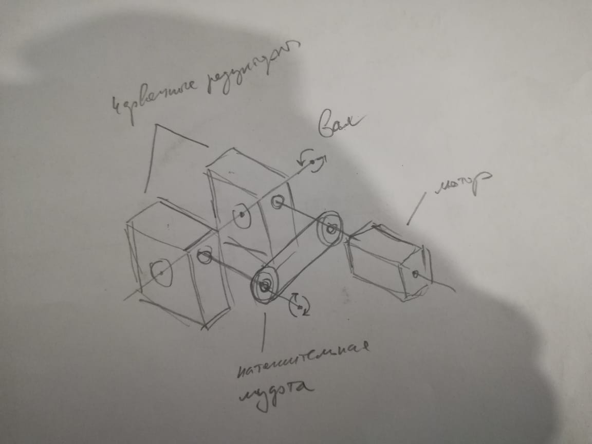 Два одинаковых редуктора на одном валу, через ремень оба вращаются двигателем, но на ведомом шкиве стоит муфта для сдвига и выборки люфта. Ремень нужен конский и натяжка соответствующая. Схема должна быть без подпружиненных натяжителей !