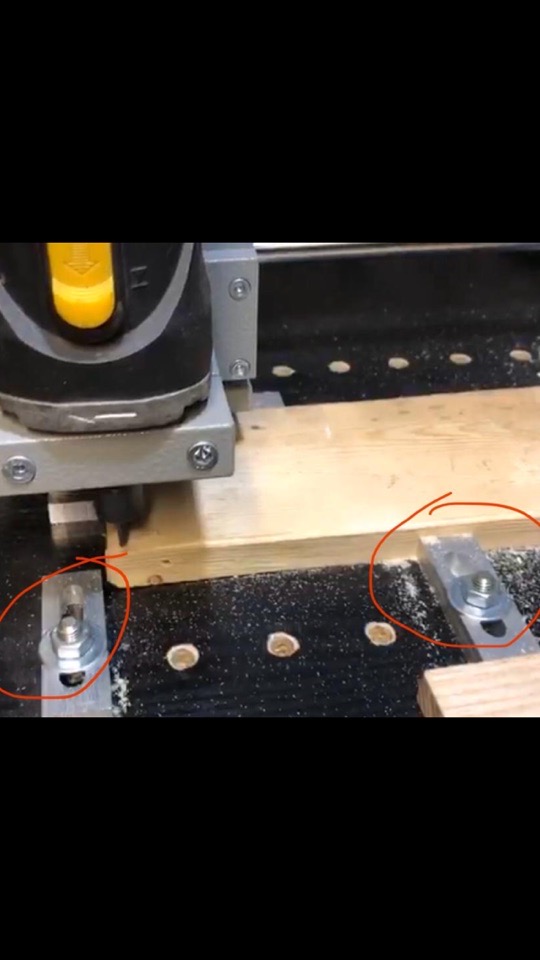 притянуть прижим к столу плотно, но не намертво; через деревяшку подбить его в сторону заготовки; затянуть окончательно. Не особо большие деревяшки - вот как на фото - на режимах мелких роутеров вполне держатся.