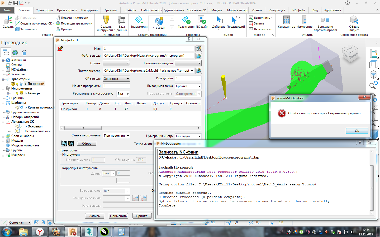 В общем, траектория вроде как нормальная, судя по визуализации, но создавать NC файл не хочет, пишет "Ошибка постпроцессора - соединение прервано"