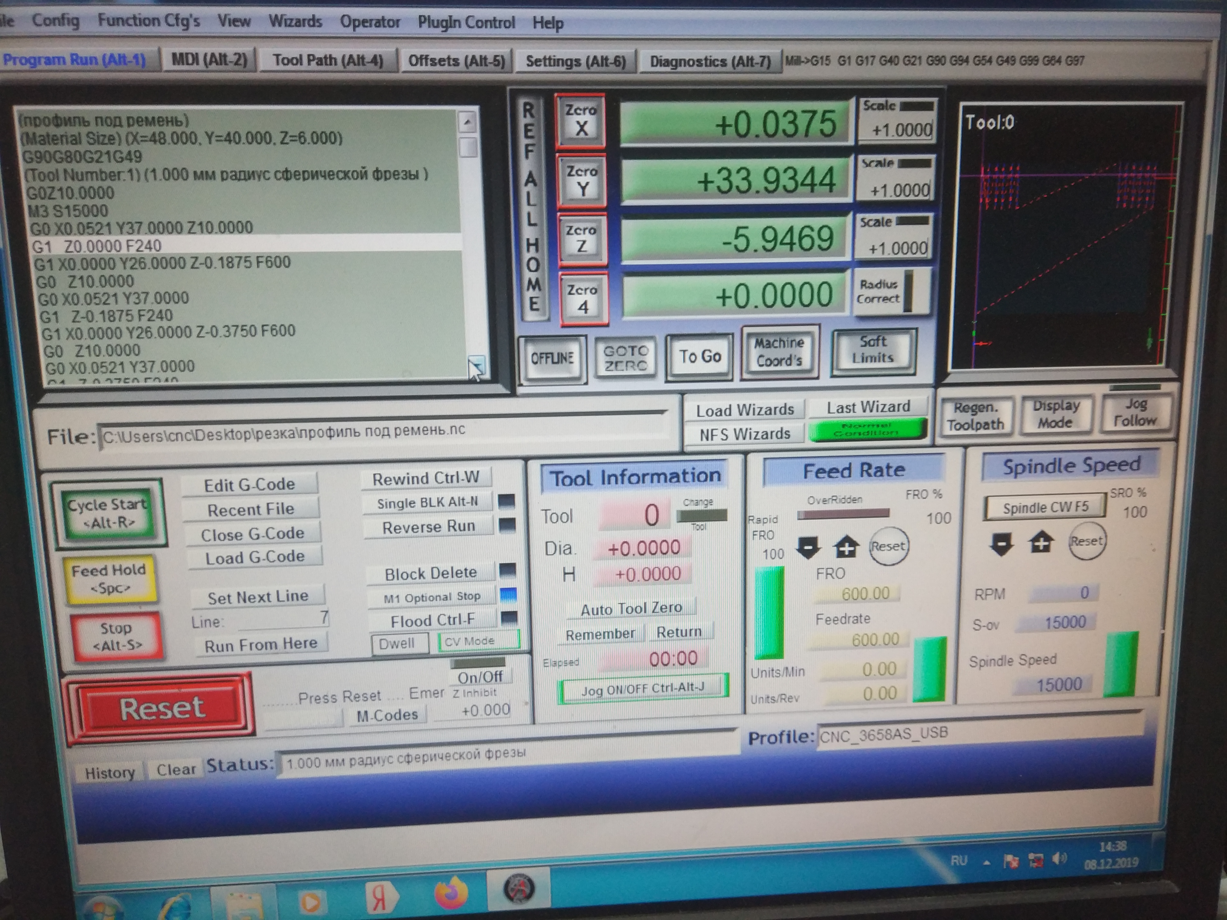 Олин раз запустил уп, шпиндель пошёл вниз глубже чем в уп указано. Перезапустил, нормально. В другой раз также, вовремя остановил, цанга не дошла до заготовки. Перезапустил, начал пилить на 10 мм выше. Третий рпз нормально.