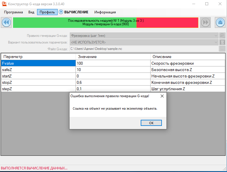 При генерации G-кода, файл с кодом не создается и вываливается ошибка.