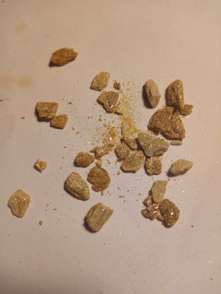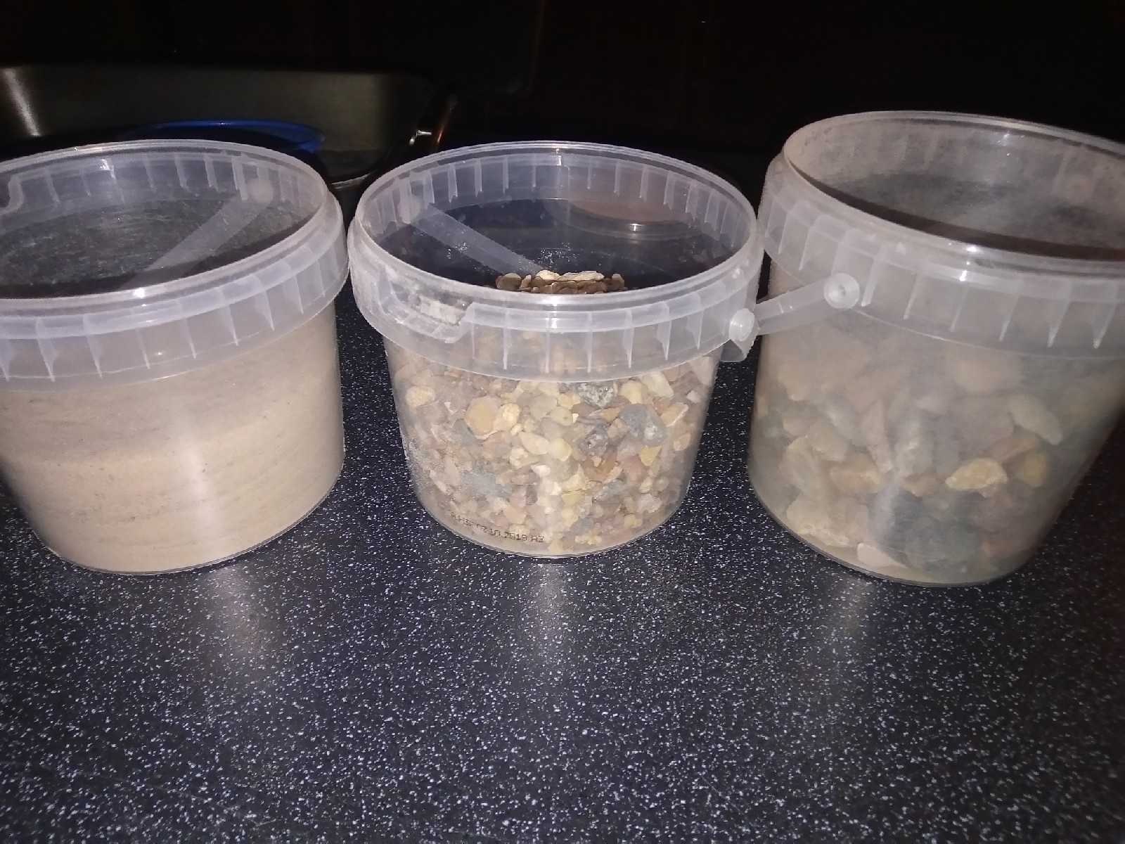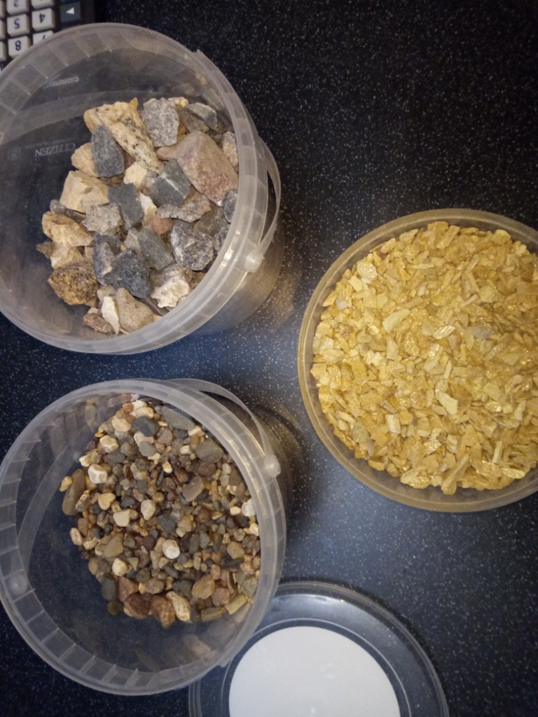 Сегодня взял ещё мешочек щебня гравийного. Хорошая штука. У него окатые края в отличии от обычного щебня. Должен утрамбовываться при вибрации плотнее. И взял мешок мраморной крошки 2-5мм, цвет золотой. Всё что было в наличии, 1 мешок . Французы розовые делают, ну а нам что не с золота то? Страна то вон как богата