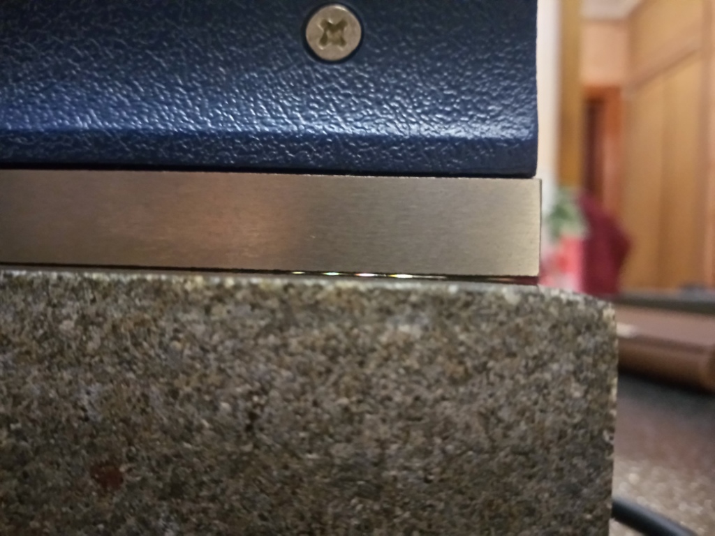 Сделал примерное обозрение куска, что вчера нашёл. Отмыл, чуть прошёл шкуркой 3000, так как пальцами на ощупь были как бы вкрапления или хорошо прилипший песок. Длина 500мм.Проверялась полированная поверхность. По краям завал на 0,1 по 10-15мм, дальше 0,05 20-25мм. В остальном промежутке середины бруска свет вообще не видно глазом. Инструменты лампа, набор щупов начиная с 0,05мм, китайский брусковый уровень 200мм (подошва шлифованная). Есть цифровой микрометр 0,01мм, но не придумал как им воспользоваться. Вернее нет эталонной поверхности относительно которой можно посмотреть. Выходит у меня дома появился кусок гранита с длинной 400+-мм не искривлённого пространства