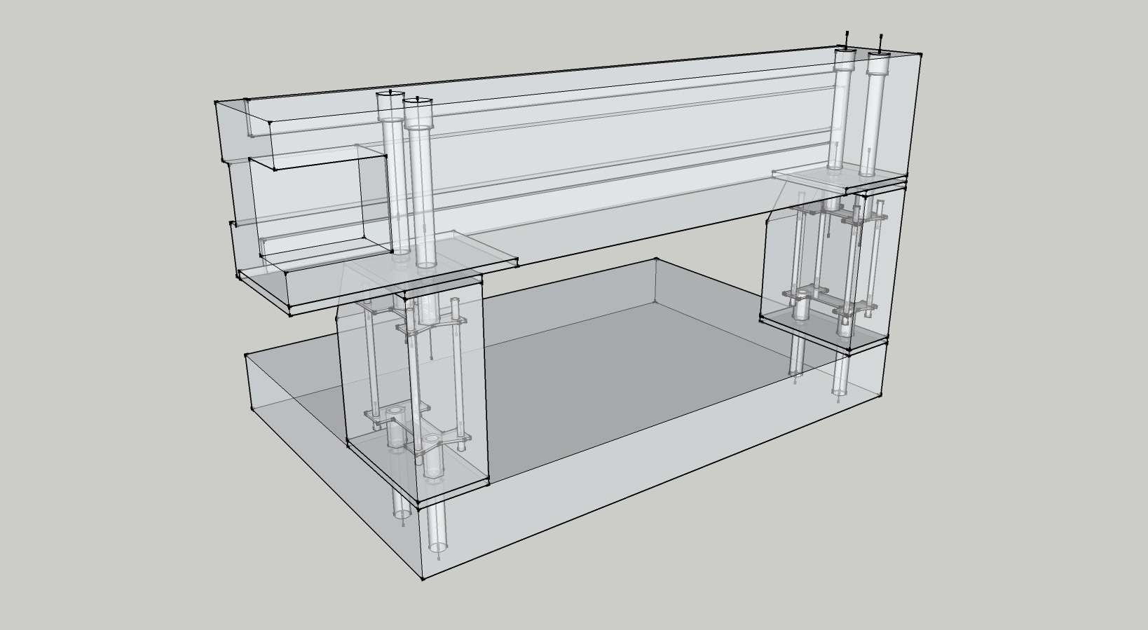 В стойке (ноге) с торцов пластины 10мм ст3. К ним точками приварены гайки переходные М16 50мм. К этим же гайкам приварены точками пластины 3мм ст3. В них отверстия и шпильки на М8 4 шт соединяют обе части между собой. Гайками на этих шпильках смогу выставить расстояние между верхней и нижней частью. Они же и арматурой будут являться.Ноги одинаковые, опалубка под две заливки.