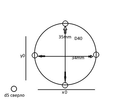 Дано - окружность диаметром 40мм на ней сидят 4 отверстия крест накрест по осям х.у. диаметр сверла 5мм, итого между готовыми отверстиями по одной оси штанген должен намерять ровно 35мм, по оси у всё чётко, 35мм а по оси ч 34мм...ушёл миллиметр! и так всегда,ну очевидно что надо сделать тесты, ну я погонял станок по всем осям на долгих прогах в холостую по всем осям и он возвращается в индикатор всегда, погрешность 2 сотки, и с рабочим шпинделем и без, и по диаганалям и по прямым участкам, и на низких и на обычных скоростях. но стоит мне задать прогу на этот чёртов круг как он промахивается по оси х на 1мм!!! дело не в уп, я и руками координаты вбивал, всё одно - минус миллиметр. Ну стал грешить на муфты, проверил всю механику - всё отлично... просто уже не знаю куда копать, это не наводки, не муфта, не мач и не комп.. прилагаю схему для наглядности