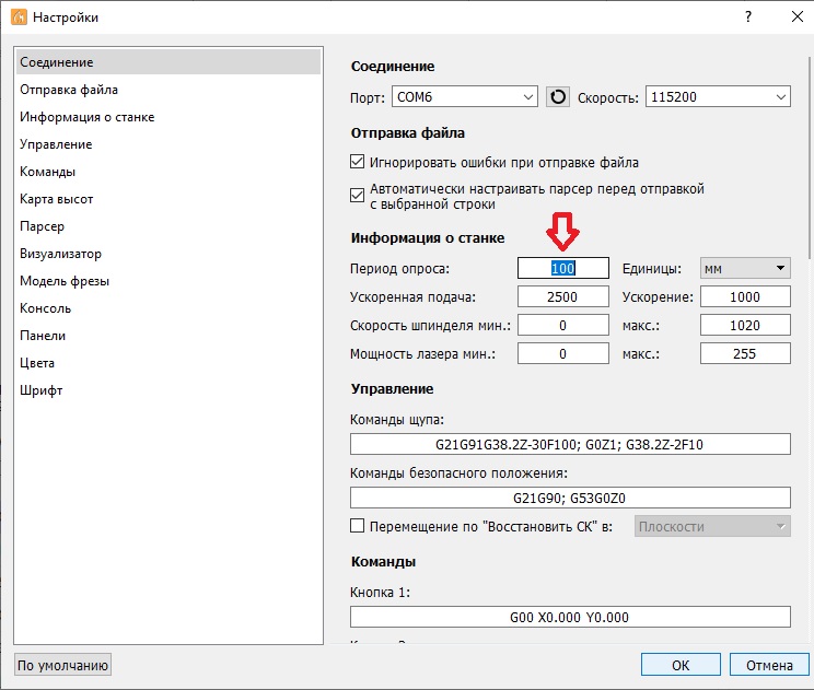 Этот параметр отвечает за посылку команды "?" в ответ на которую контроллер шлет информацию о текущем статусе контроллера, его координатах, и прочей ерунды....длиной около 100-150 символов...survizor писал(а):Выжигаю в программе Candle 1.1.7, она как раз для прошивки grbl 1.1, тоже в разных точках останавливался станок и весел.