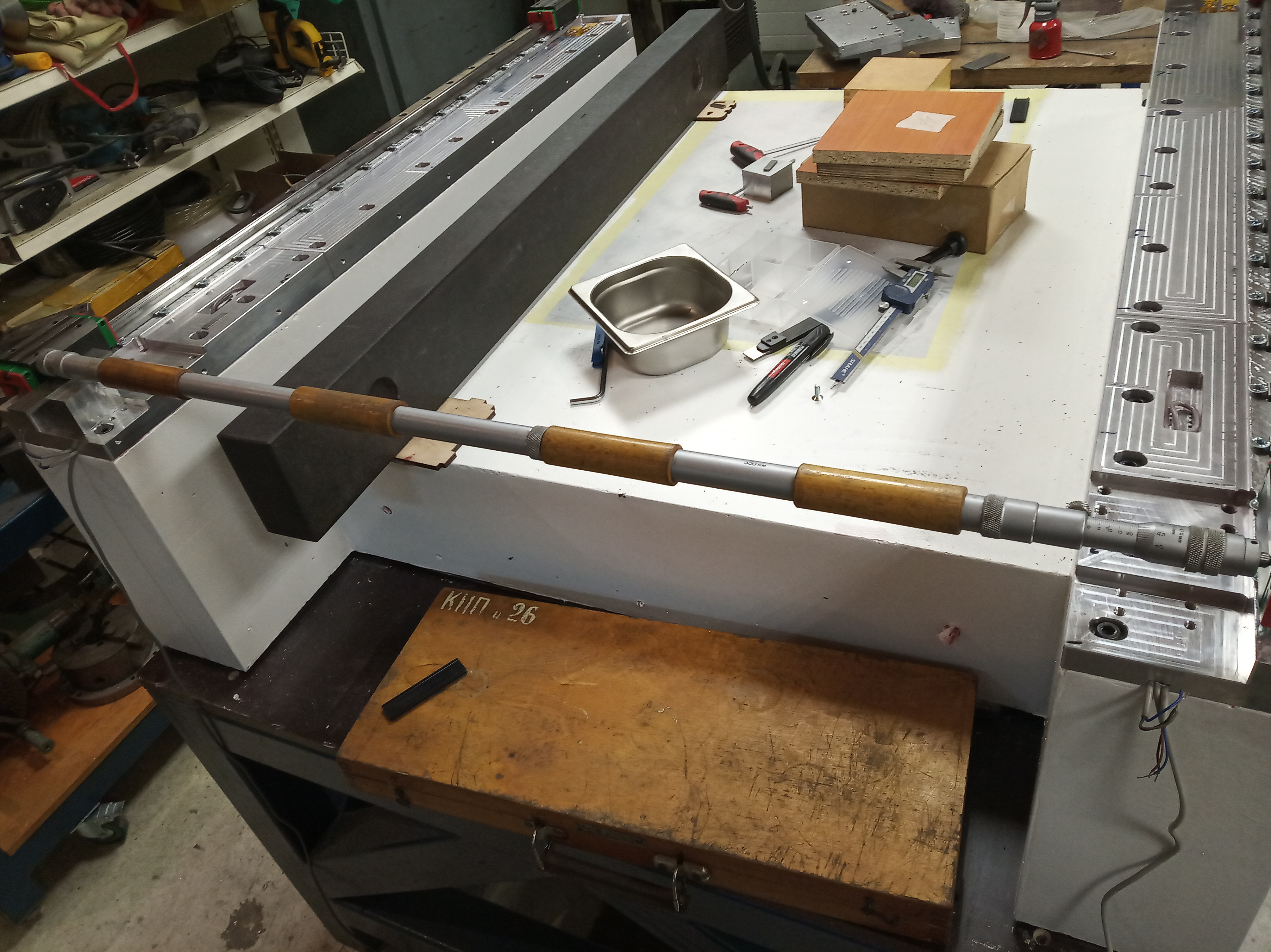 После чего выкатал его по линейке в горизонтальной плоскости, используя поджимы роликовые с двух сторон от рельса. Получилось весьма удобно, примерно за полчаса удалось выкатать направляющую примерно в ту же сотку.