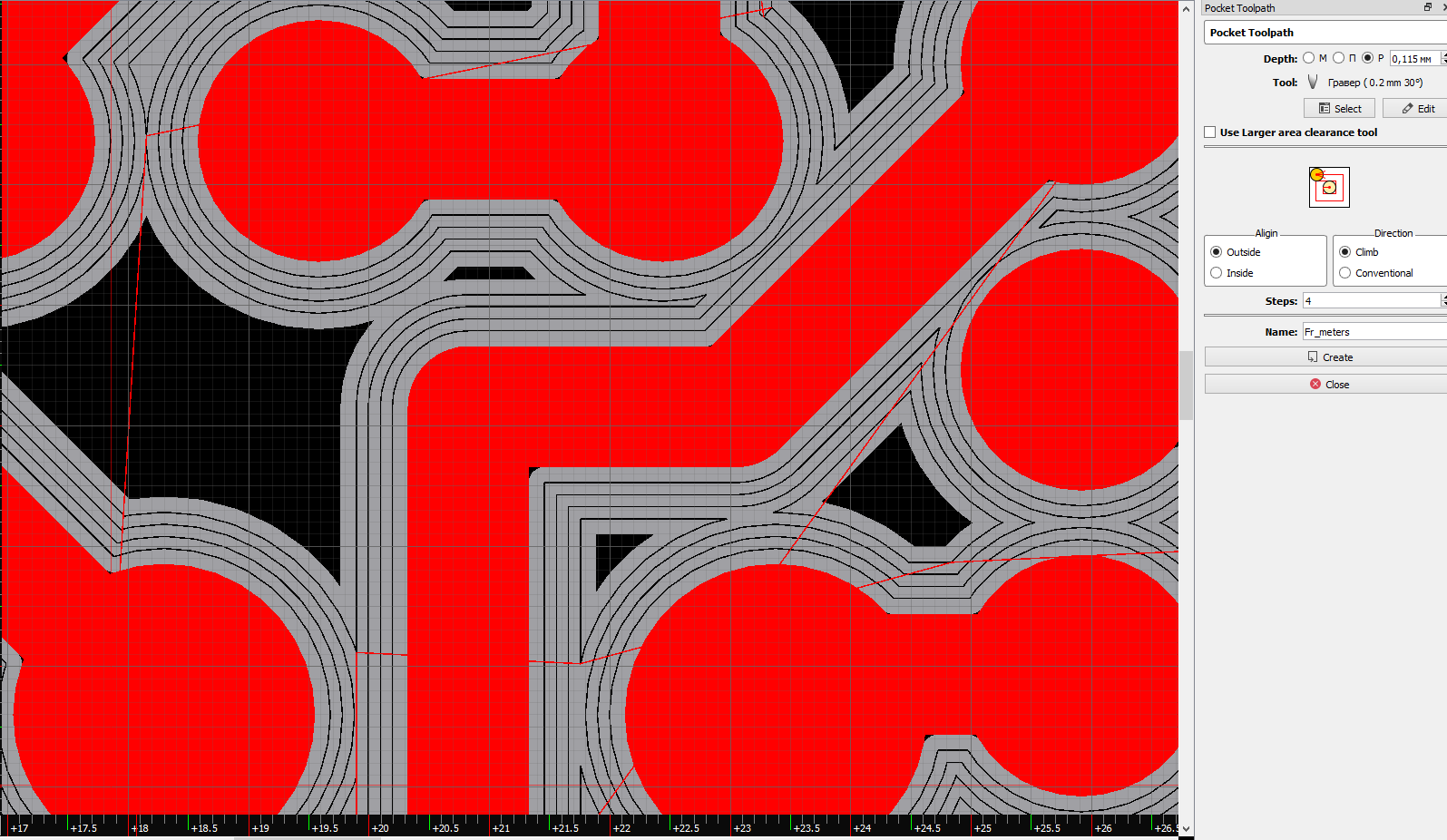 И предлагается в настройках сделать программируемым ОТСТУП между площадями съёма меди этими фрезами или сделать его нулевым (то есть площади не пересекаются) или немного изменить алгоритм стыковки смежных мест?