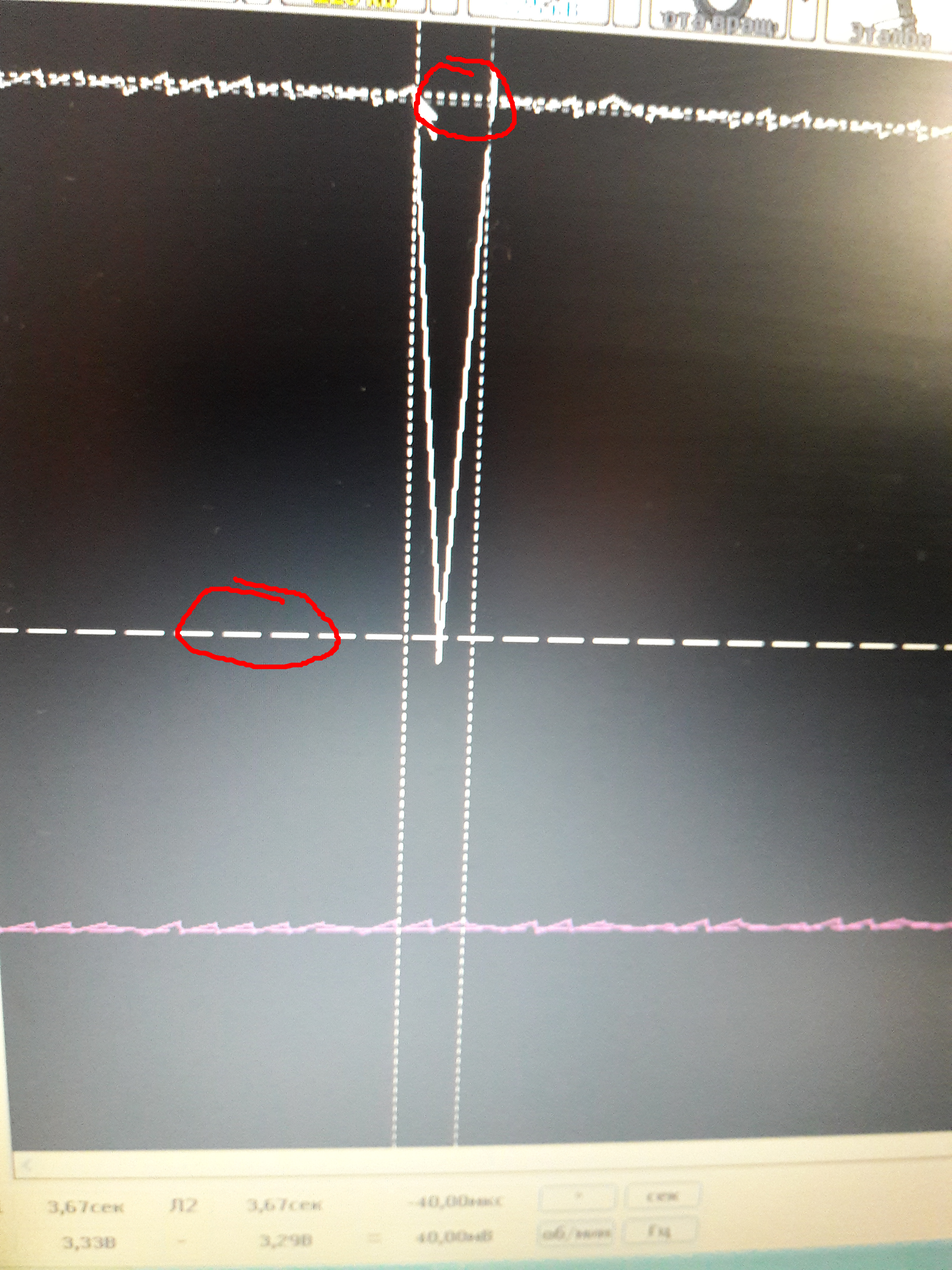 Горизонтальная одна ноль вторая второй канал тоже ноль ,он не задействован.Две вертикальные это измерительные "линейки" ,ставим курсором левой и правой мышкой .40 микросекунд ,время между "линейками",ну а 40 это дельта между 3,3 и 2,9. Форма импульса условная ,развёртка 10 секунд.На счёт препинания глуп барин ,ну глуп!