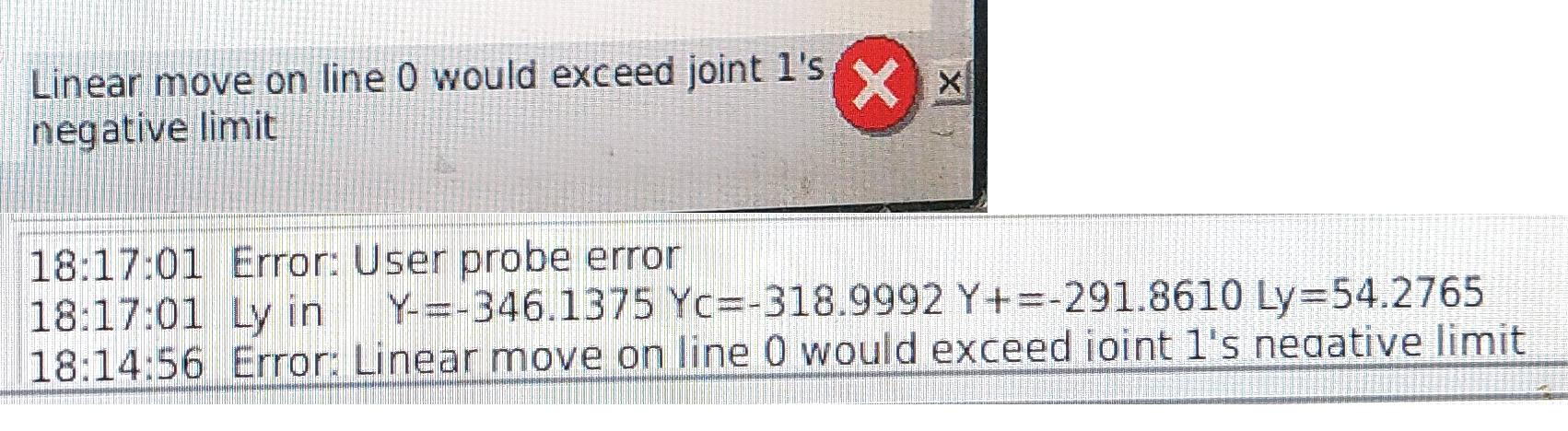 станок движется щупом вниз (Y-) , касается, движется вверх, касается и залипает с ошибкой (Error: Linear move on line 0 would exceed joint 1 negative limit) До концевиков далеко, отверстие 54мм. По оси Х те же ошибки. В чем может быть проблема?