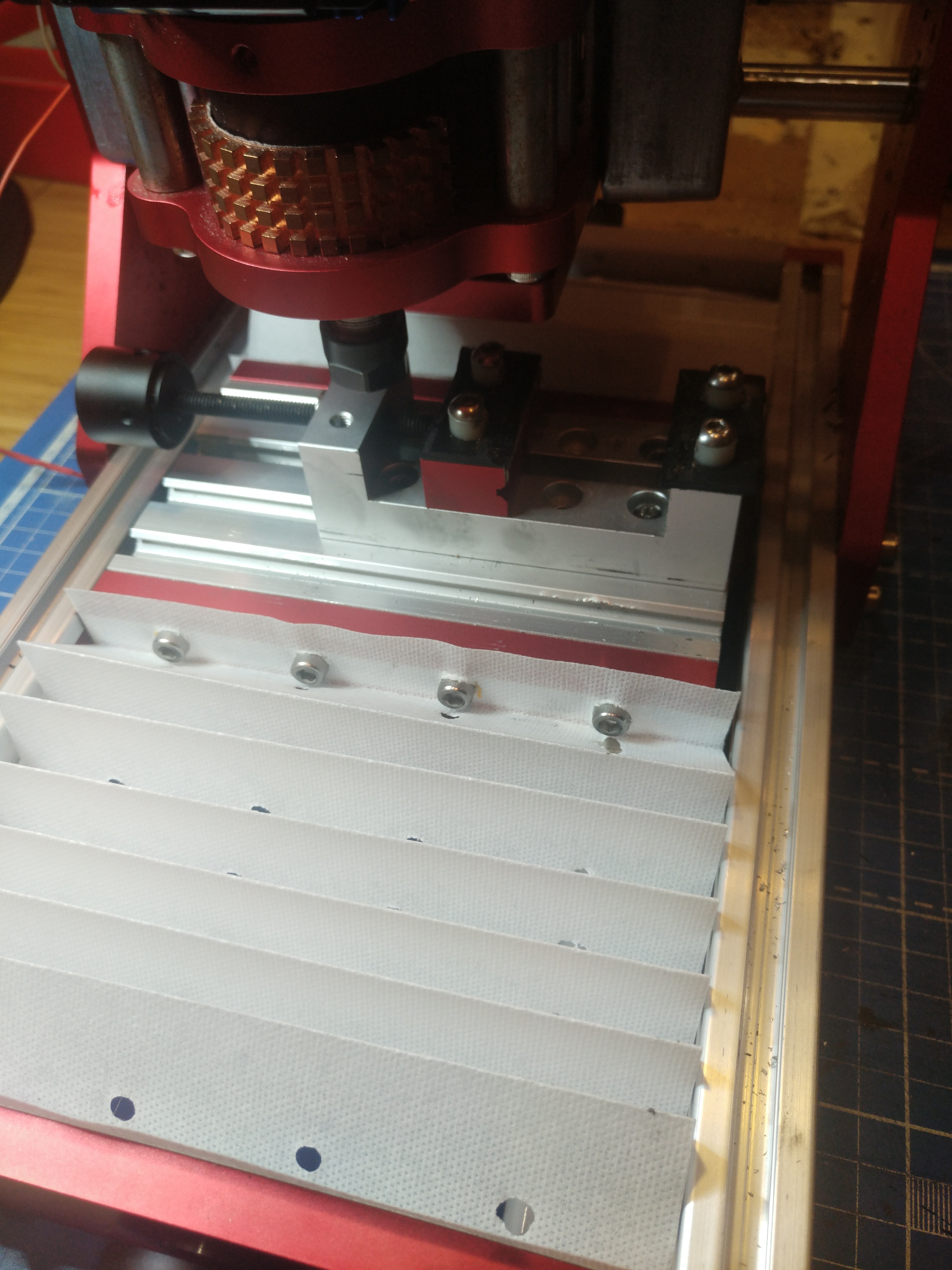 Не, выносить выше профиля не вариант вообще. Я и в таком конфиге переживаю, что будут проблемы с теми деталями, которые надо будет крепить прям на столик, а не в тиски, и которые будут выходить за края столика (т.к. они будут придавливать гармошку). Если поставить гармошку на боковой профиль - она будет по высоте впритык до пластины оси Z наверно. В идеале было бы поставить плоские (потайные) болты на столик, а гармошку найти с чуть более низким гребнем.. Но пока попробую, как пойдет. Как минимум на приводной шкив грязь не будет лететь (над ним дырок нет), а то пару раз запарывал заготовки из-за клина - стружка попадала в гайку :(((