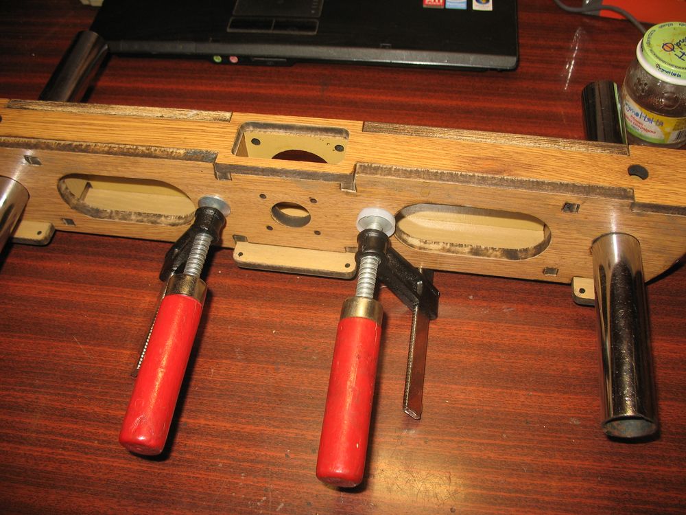 Дальше процесс склейки, если отдельно каждая деталь мдф кажется хлипковатой, то при склейке в изделии становится крепкой и прочной. Клеил эпоксидкой , те детали которые резались из 8мм ламината были ламинированы с обоих сторон , ту сторону которая попадает под склейку надо пошкурить чтоб клей зацепился лучше. А вообще стараюсь внешней стороной корпусной детали делать внешнюю сторону ламината, как там по классификации стирания ламинат 32 класса )))