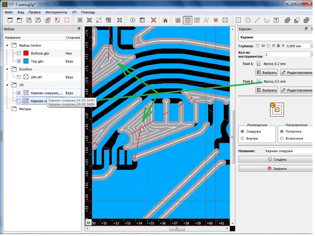 Полный нубас в теме фрезеровки плат, но есть ряд пониманий благодаря пердолингу 3д принтеров и немного попрактиковался на 3018 с фанерой, алюминием, лазерной гравировкой. С импортом проблем не возникло, на вопросы ответы были найдены, но не могу пока точно узнать - чем "профиль" отличается от "кармана"? Карман - чтоб выбирать полигоны, например пятаки после маски?