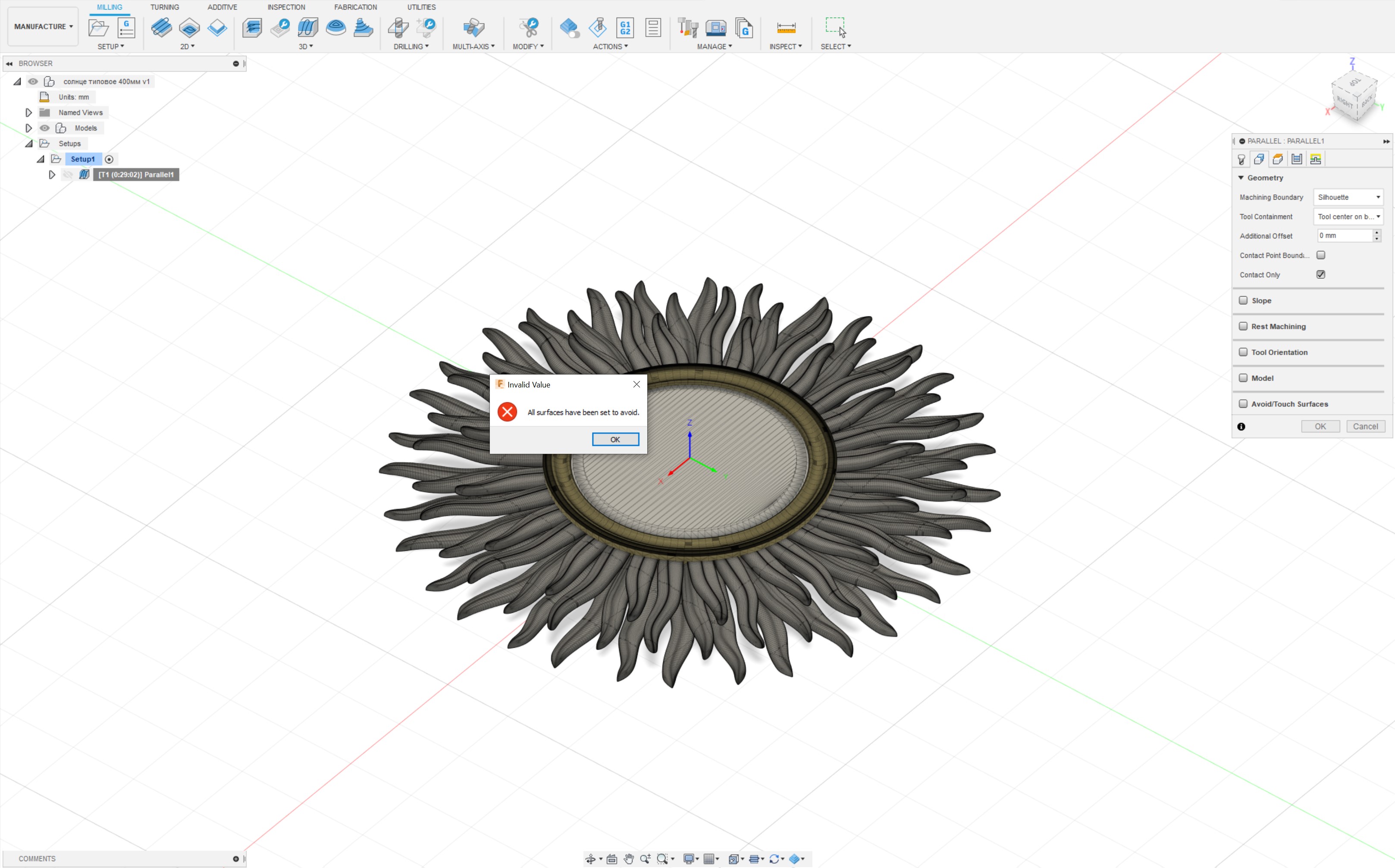 После вчерашнего обновления Fusion 360, пропала возможность делать любые чистовые обработки mesh тел. Fusion выбрасывает ошибку all surfaces have been set to avoid. На соседнем компьютере без обновления все работает как раньше. Видимо это баг так как программа думает что все тела выбраны командой avoid но это не так.