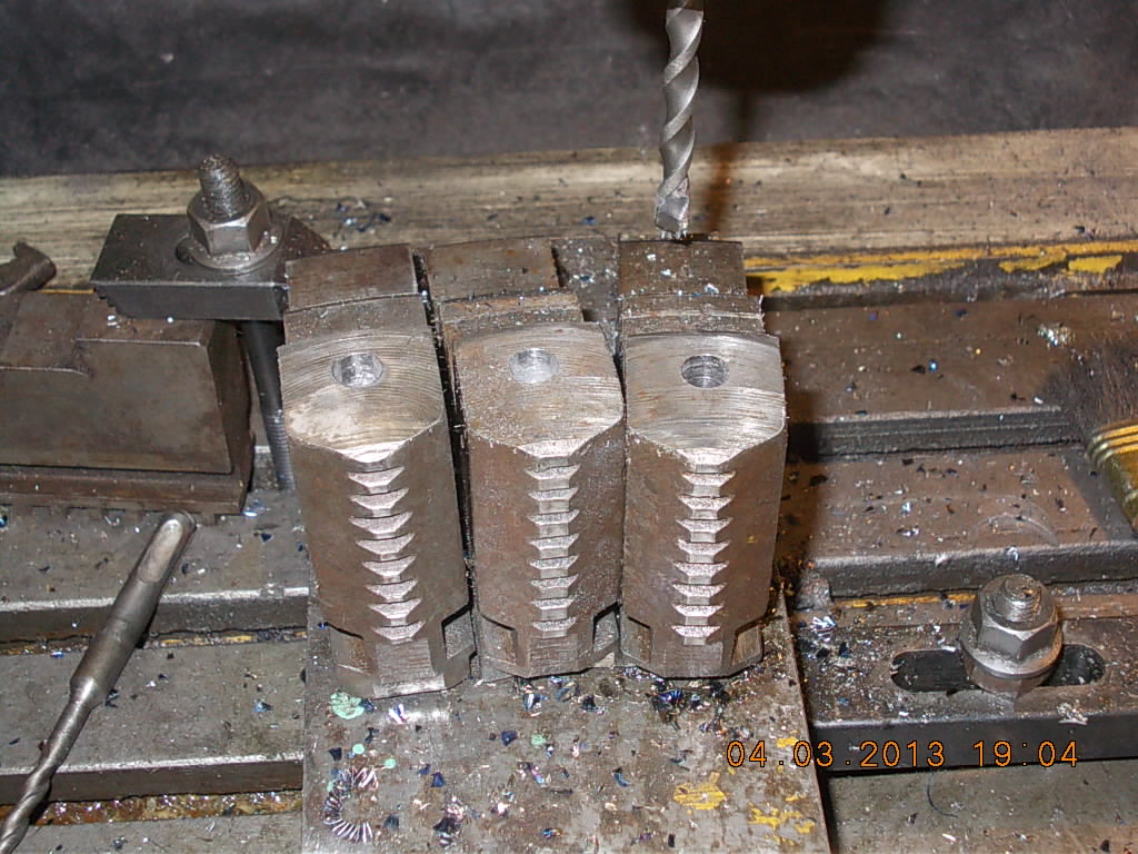 Пока суппорт клеится занимаюсь мелочевкой. В кулачках насверлил отверстий. Так как кулачки каленные и не берет их даже центровки, то сверлить пришлось буром(сверла для бетона они же победит) переточенным на алмазе.