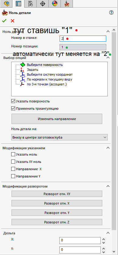 это я сместил позицию по z. а если бы сместил еще и по х и у? тогда нужно было бы ехать станком в эту точку и вбивать в этом месте нули. ну или вернее замерять расстояния на модели и опять на калькуляторе рассчитывать смещение и вбивать их руками.. так?