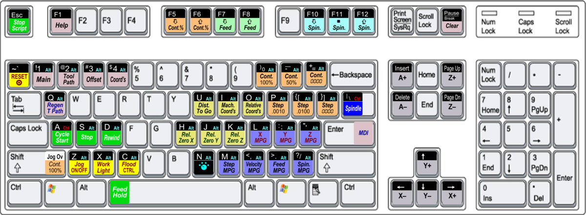 С этой конструкции я вытащу платку , размещу на станке и подпаяю свои кнопки. Предварительно в настройках мач3 выставил коды нужные . Это перемещение ручное по осям, пуск, Стоп, Пауза, 0-Х, 0-Z. С помощю програмки Key Tweak переназначил клавиши Tab Ctrl Shift Rewind. Осталось 4 клавиши на которые я хочу поставить ручное перемещение по осям ( больше меньше) ну и управление подачей (больше меньше) Вот только не знаю как это сделать. В скринсете для фрезера эти кнопки работают. (+ -) и F10 F11.