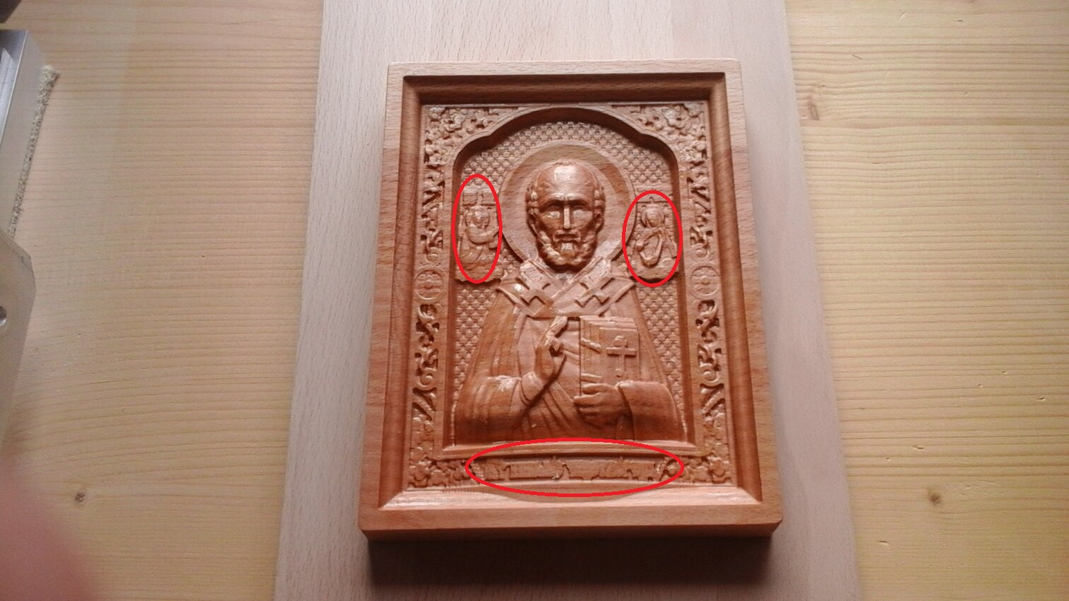 Николая Чудотворца действительно резал толстоватой конической фрезой с кончиком 2.0мм, сфера. Из-за этого надписи и "замылились". Конечно такие вещи надо резать более тонкими фрезами, но тут сыграл свою роль фактор времени. Дачный сезон заканчивался, а одному человеку надо было срочно вырезать.