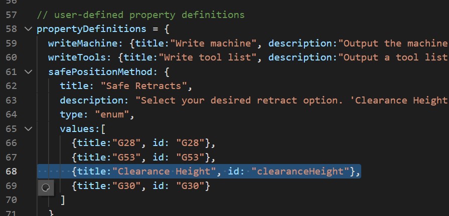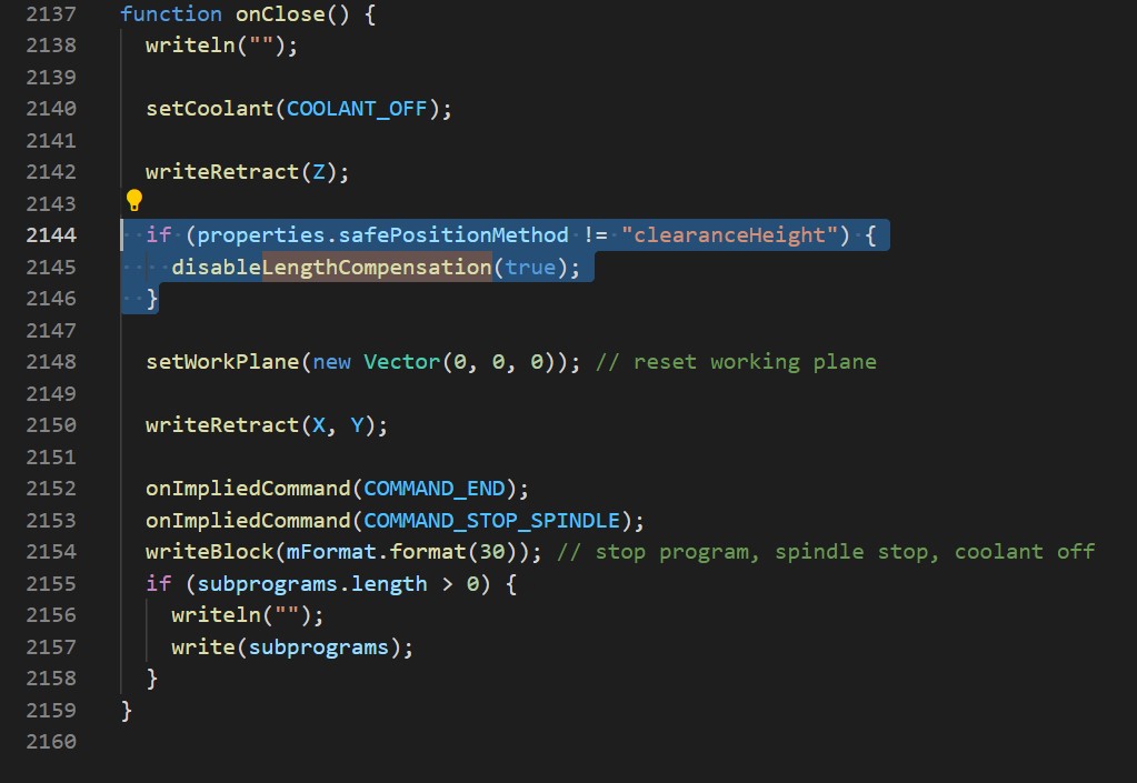 1 вот это раскоментить, в настройках выше появится 4ая строчка. (чес сказать не оч понятно, зачем они её заблокировали) 2 вот здесь, в конце, добавить такую проверку (типо нельзя отключать компенсацию, если ретракт только до клиренса. отключаться будет только если в до г28 поднимется) Как ты можешь заметить, в writeRetract() есть запрет на использование клиренсхайт, если операция будет многосевая... ну оно как бы логично, хотя у тебя всего лишь поворотка, можно там эту проверку тоже порезать, по идее